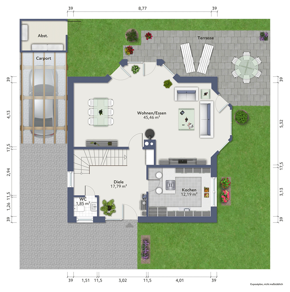 Darüber hinaus gehören zur Immobilie ein Carport mit angrenzendem Abstellraum sowie ein zusätzlicher Freistellplatz direkt vor dem Haus.