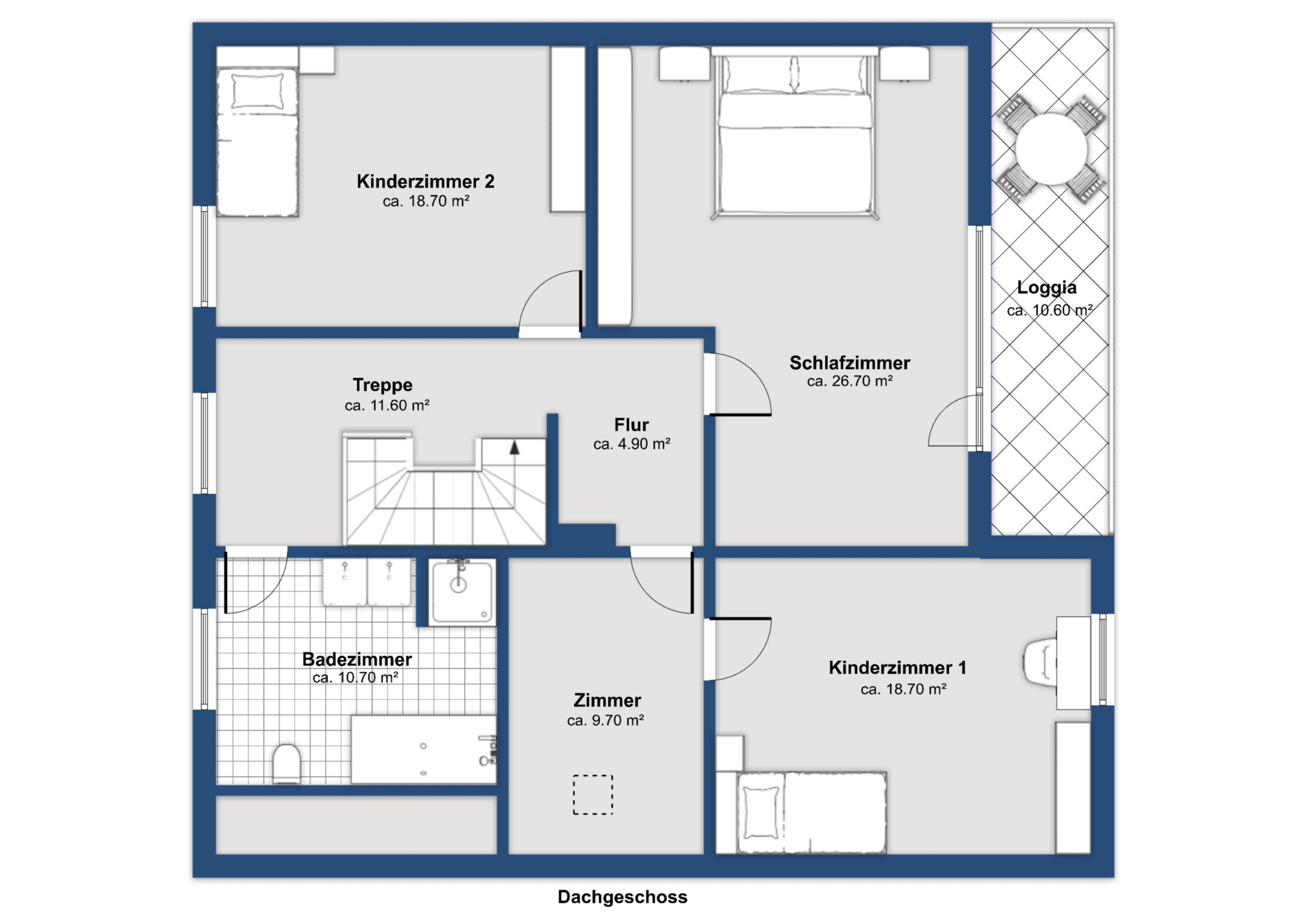 Über die Treppe gelangen Sie in das Obergeschoss, das den privaten Rückzugsbereich der Familie bildet. Das Elternschlafzimmer ist großzügig dimensioniert und bietet ausreichend Stellfläche für ein großes Familienbett sowie weitere Möbel. Praktischerweise verfügt dieser Raum über einen direkten Zugang zum großzügigen Westbalkon, der insbesondere an warmen Sommerabenden einen angenehmen Rückzugsort vor dem Zubettgehen bietet.