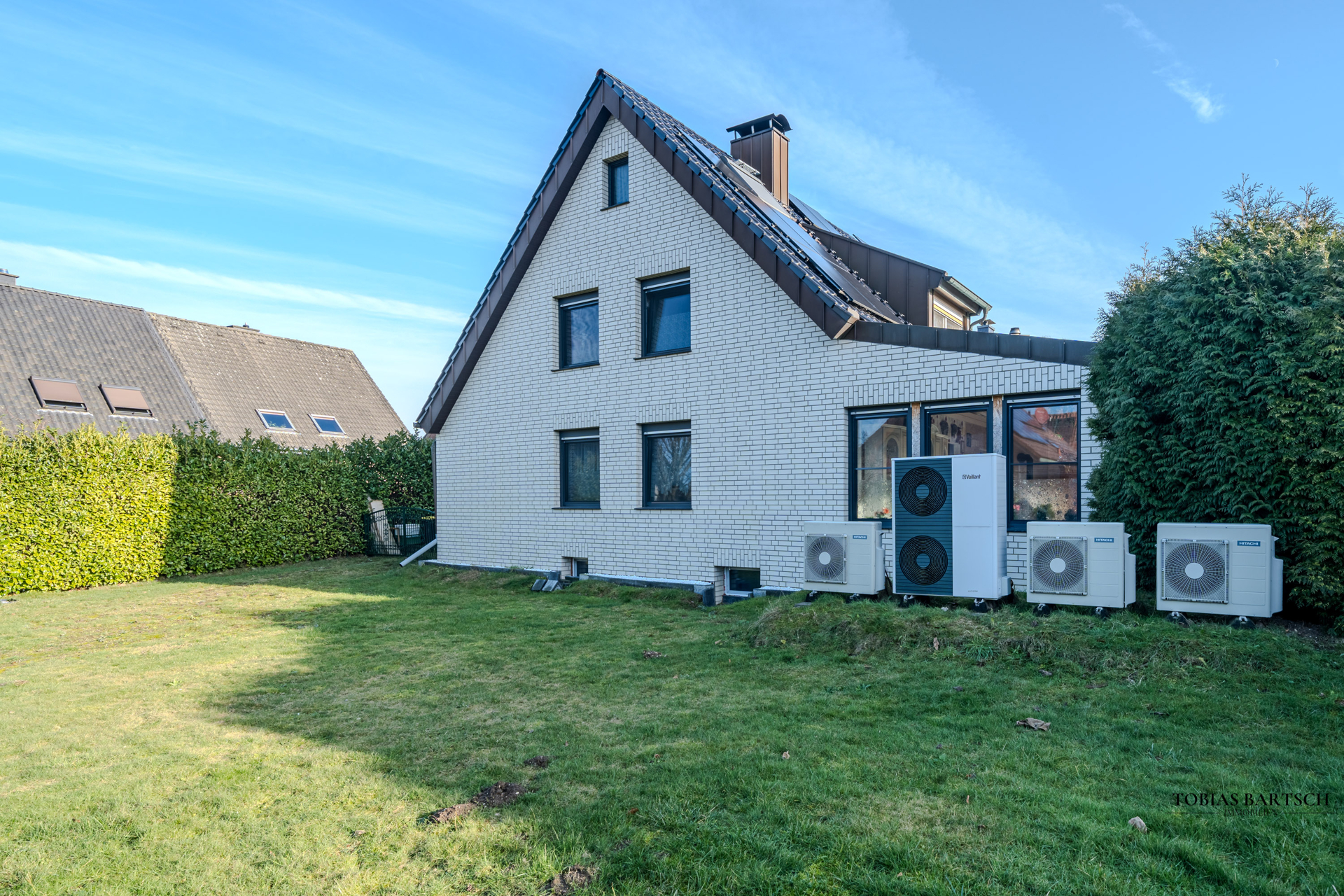 Im Rahmen der Kernsanierung wurden unter anderem die komplette Heiztechnik erneuert, die Fassade überarbeitet, das Dach vollständig neu aufgebaut und mit einer ca. 24 cm starken Dämmung versehen sowie sämtliche Rohrleitungen ersetzt. Die Immobilie wird über eine moderne Wärmepumpe beheizt und erreicht einen exzellenten energetischen Standard (Energieeffizienzklasse A+, KfW-70). Ergänzt wird das Energiekonzept durch eine leistungsstarke Photovoltaikanlage mit 12,94 kWp inklusive eines 10 kWh-Speichers. Zwei Kamine sorgen zusätzlich für Wohnkomfort und Atmosphäre. Die verbauten dreifach verglasten Fenster mit Schutzgasfüllung sowie eine professionelle Entkalkungsanlage im Keller unterstreichen den hohen technischen Anspruch.