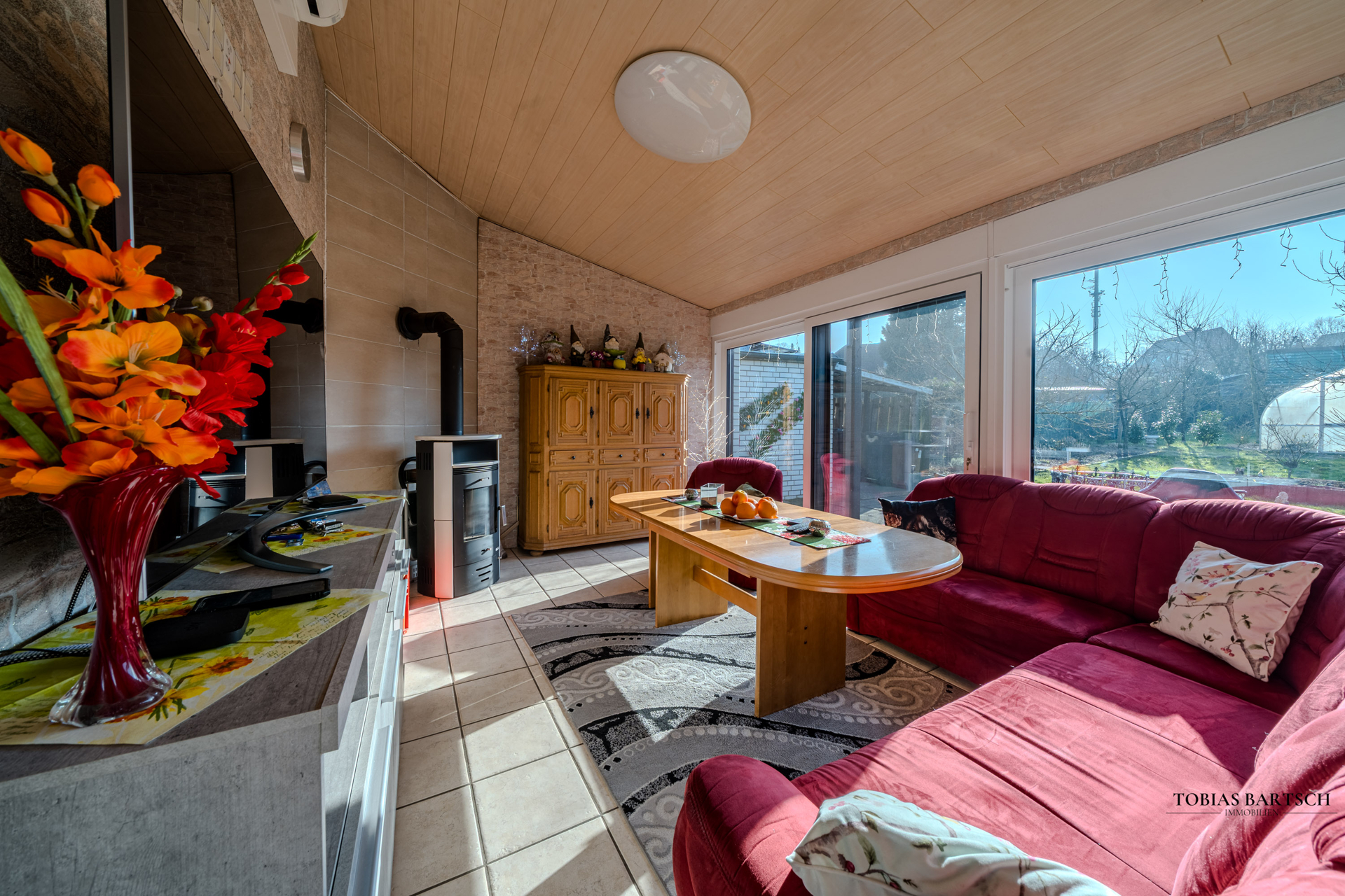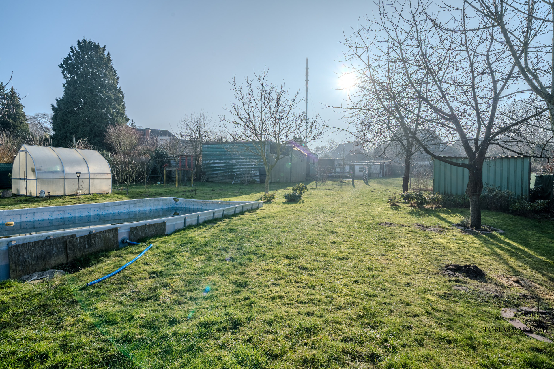 Der äußerst großzügige Garten mit einer Fläche von rund 1.900 m² ist ein echtes Highlight der Immobilie. Neben einer sonnigen Terrasse und einer großen, elektrisch per Funk steuerbaren Markise stehen mehrere Nebengebäude zur Verfügung: zwei große Schuppen, eine Werkstatt sowie ein weiterer kleiner Schuppen, der unter anderem zur Holzlagerung für den Kamin genutzt wird. Ein 11 × 5 m großer Pool fügt sich harmonisch in das Grundstück ein; eine Beheizung über Wärmepumpe ist möglich und kann nachgerüstet werden. Zusätzlich befindet sich ein voll ausgestattetes Gewächshaus auf dem Grundstück, in dem aktuell verschiedenste Pflanzen angebaut werden.