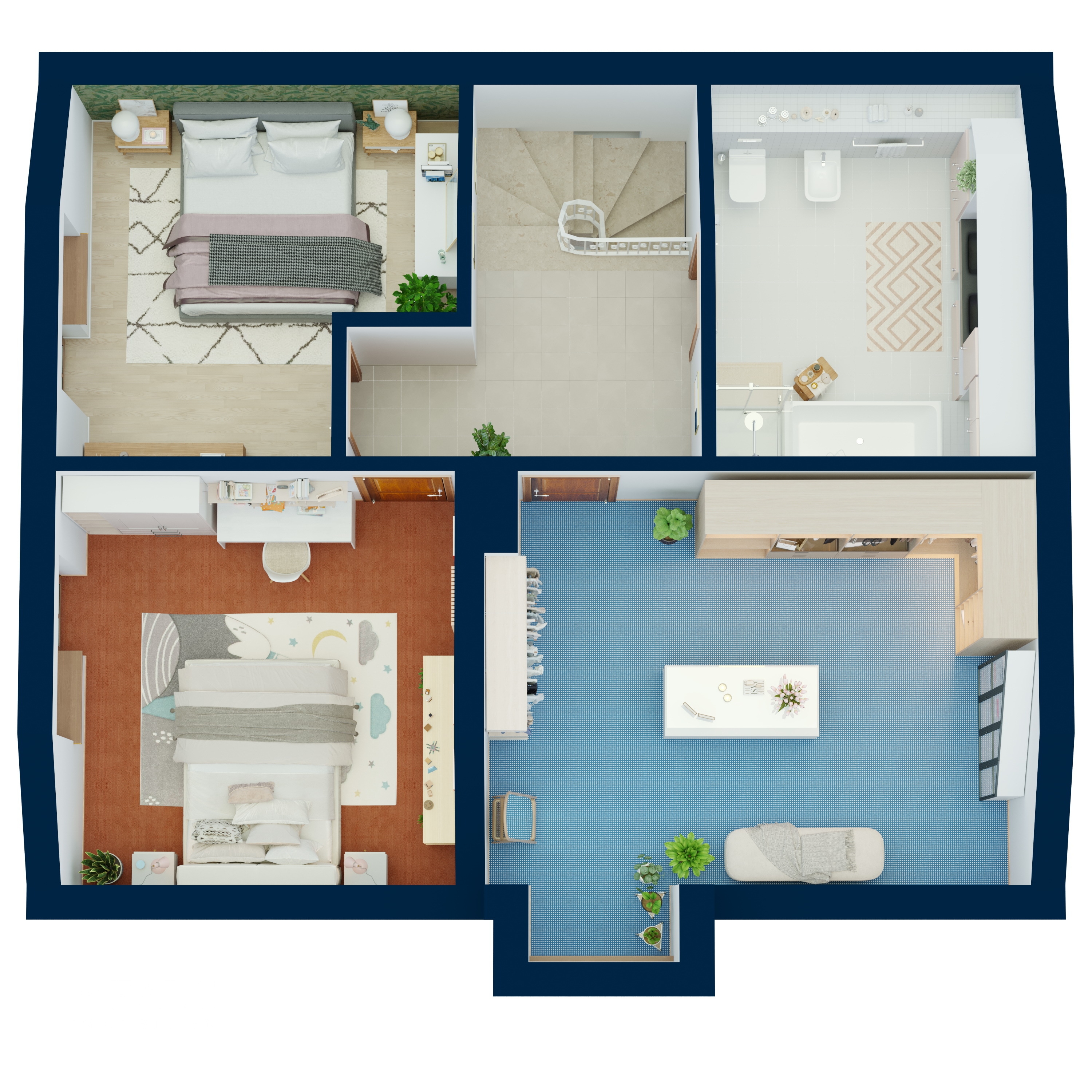 Im Obergeschoss befinden sich drei Schlafzimmer, die individuell gestaltet werden können. Das Hauptschlafzimmer bietet viel Platz und Komfort. Ein weiteres Zimmer eignet sich hervorragend als Kinderzimmer oder Büro. Die Ankleide bietet zusätzlichen Stauraum und sorgt für Ordnung.