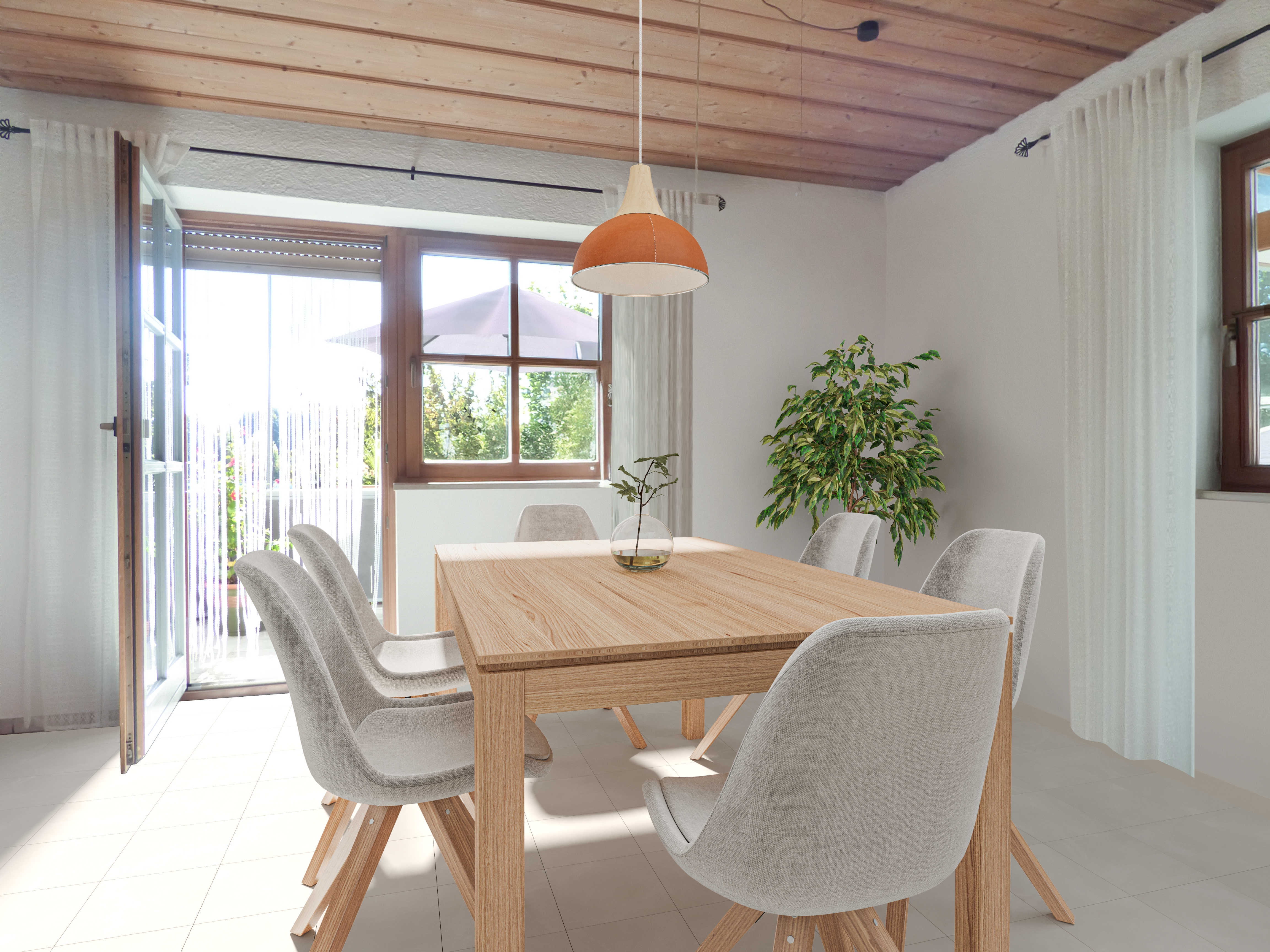 Angrenzend finden Sie das Esszimmer, das durch große Fenster viel Tageslicht bietet und einen direkten Zugang zum Balkon ermöglicht. Der Balkon bietet einen herrlichen Ausblick und ist ideal für entspannte Stunden im Freien.