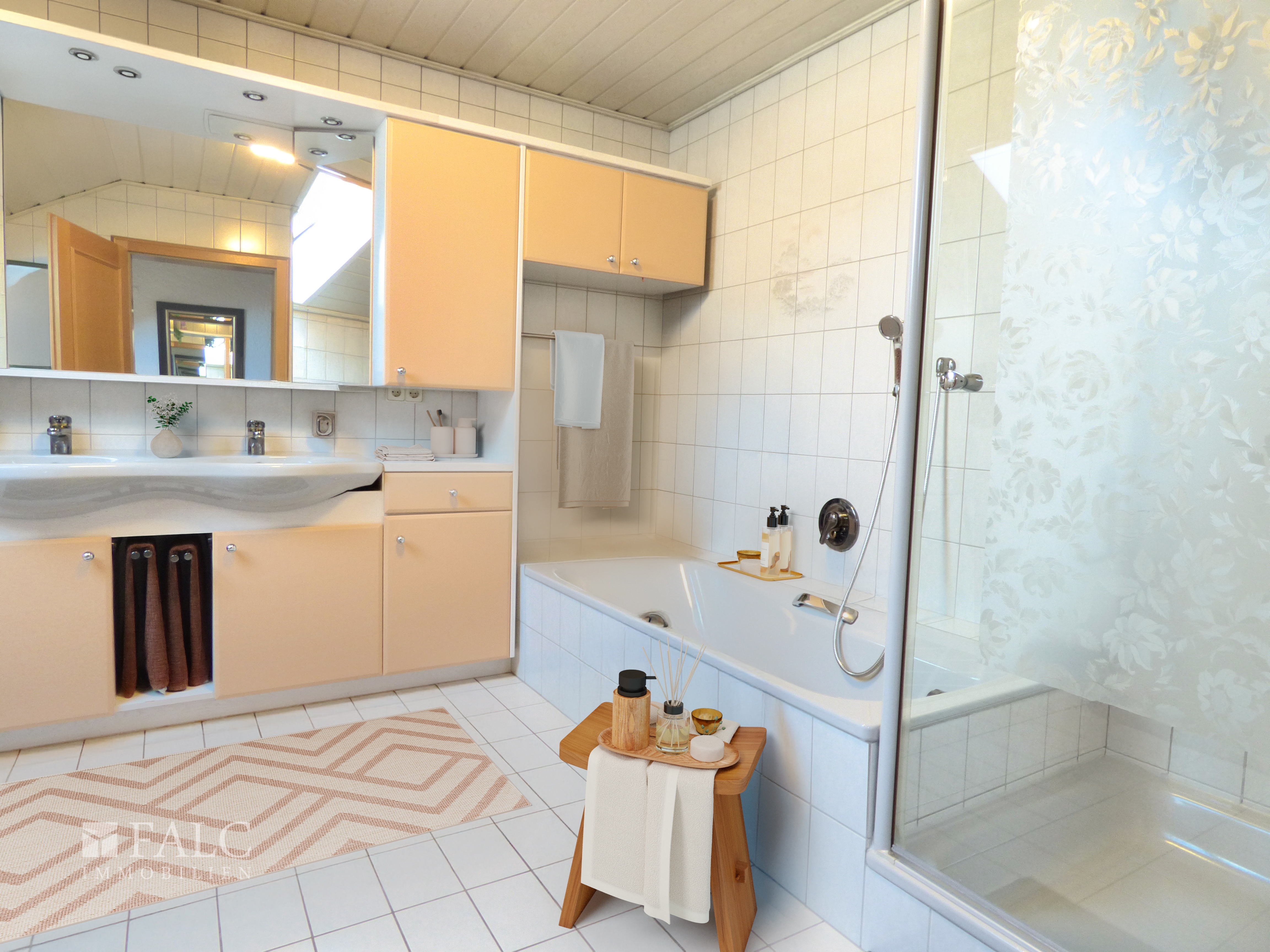 Das Badezimmer ist mit einer Badewanne und einer separaten Dusche ausgestattet, was den morgendlichen Ablauf erleichtert. Ein Gäste-WC im Erdgeschoss bietet zusätzlichen Komfort für Besucher.