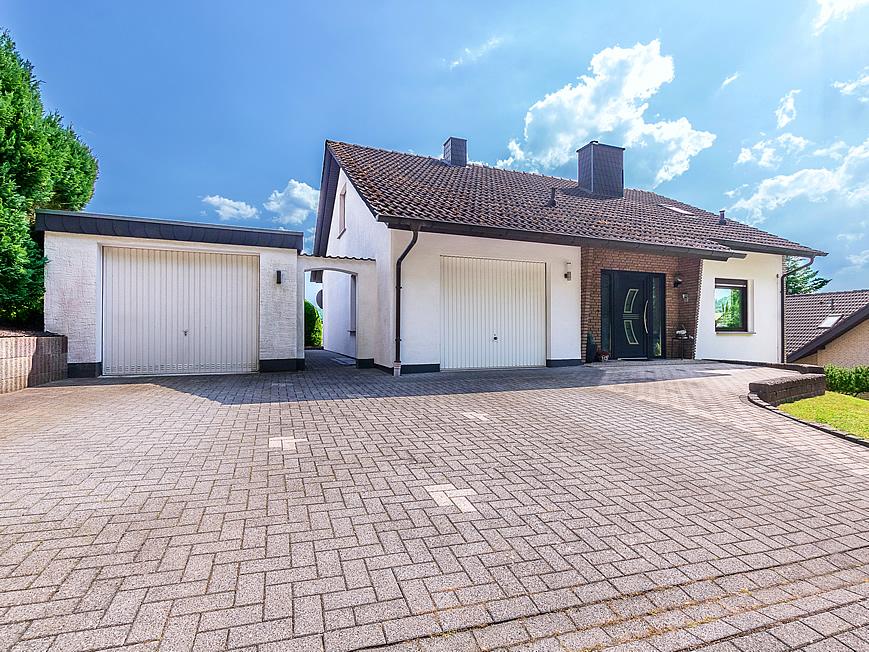 Zwei Garagen sowie eine breite Einfahrt bieten Platz für Ihre Fahrzeuge und die Ihrer Gäste.