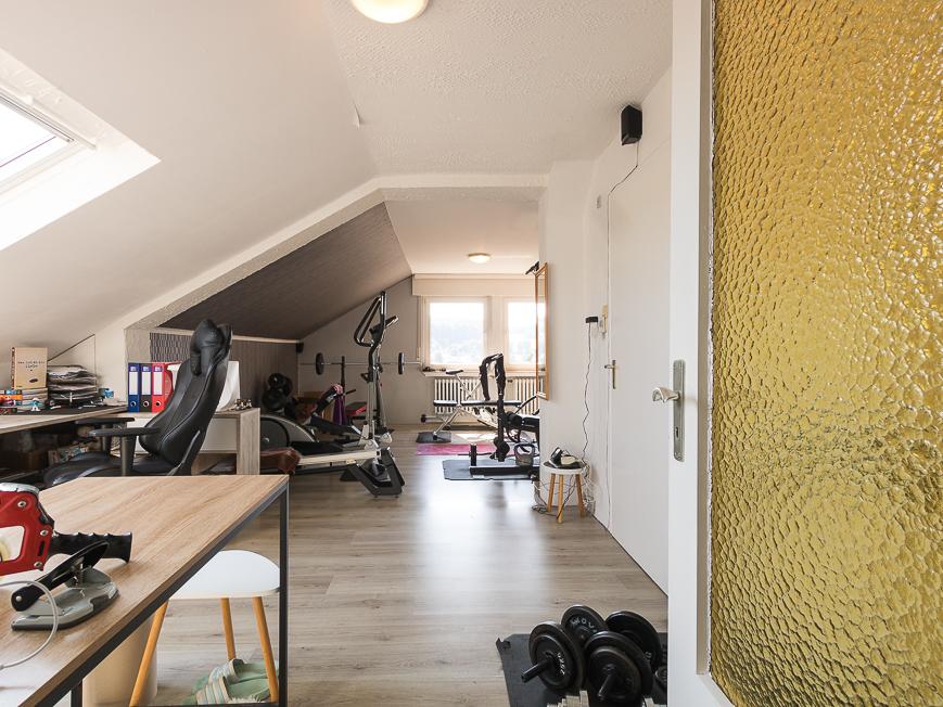 Das Dachgeschoss als dritte Etage mit insgesamt knapp 40 m² Nutzfläche wurde bereits ausgebaut und verfügt über eine große Studiofläche samt Duschbad sowie ein weiteres separates Zimmer – perfekt als Rückzugsort für ein älteres Kind, für konzentriertes Arbeiten in ruhiger Atmosphäre oder eben als Fitnessraum für sportliche Aktivitäten zu Hause.