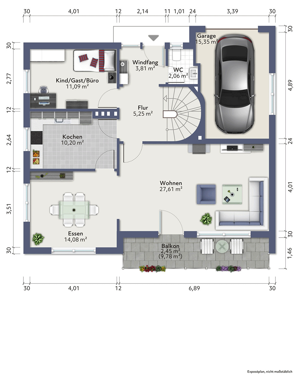 Im Inneren erwarten Sie ca. 144 m² Wohnfläche, verteilt auf sechs Zimmer und zwei Etagen. Das Herzstück ist der offen gestaltete Wohn-/Essbereich mit Kamin und Zugang zum Balkon. Die Küche liegt direkt neben dem Esszimmer. Wer von einer offenen Kochlandschaft träumt, kann die Räume miteinander verbinden – sprechen Sie einfach mit unserem Architekten darüber. So oder so: Auf mehr als 50 m² entsteht hier Ihr neuer Lebensmittelpunkt. Ein separates Zimmer (Kind/Gast/Büro), ein Gäste-WC sowie ein großzügiger Eingangsbereich ergänzen das Erdgeschoss.