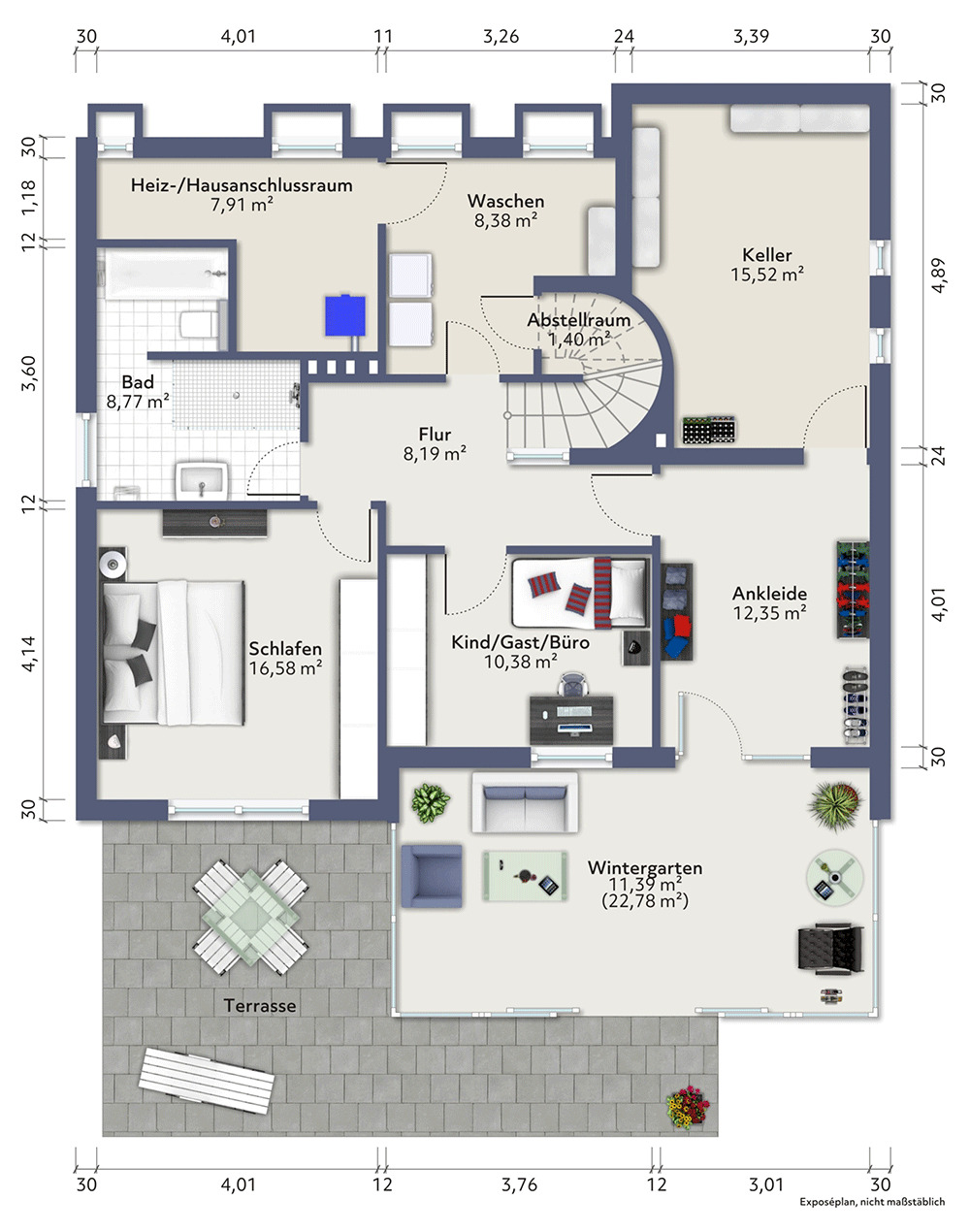 Eine Etage darunter liegt das Gartengeschoss mit zwei hellen Schlafzimmern, einem Ankleidezimmer, einem modernen Familien-Tageslichtbad mit großer Dusche und Badewanne sowie einem gemütlichen Wintergarten – ideal für entspannte Lesestunden oder den Blick ins Grüne bei jedem Wetter. Zur Straßenseite hin befinden sich drei praktische Kellerräume mit einer Nutzfläche von rund 33 m².