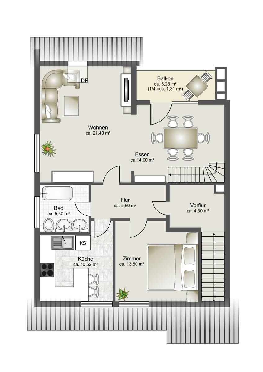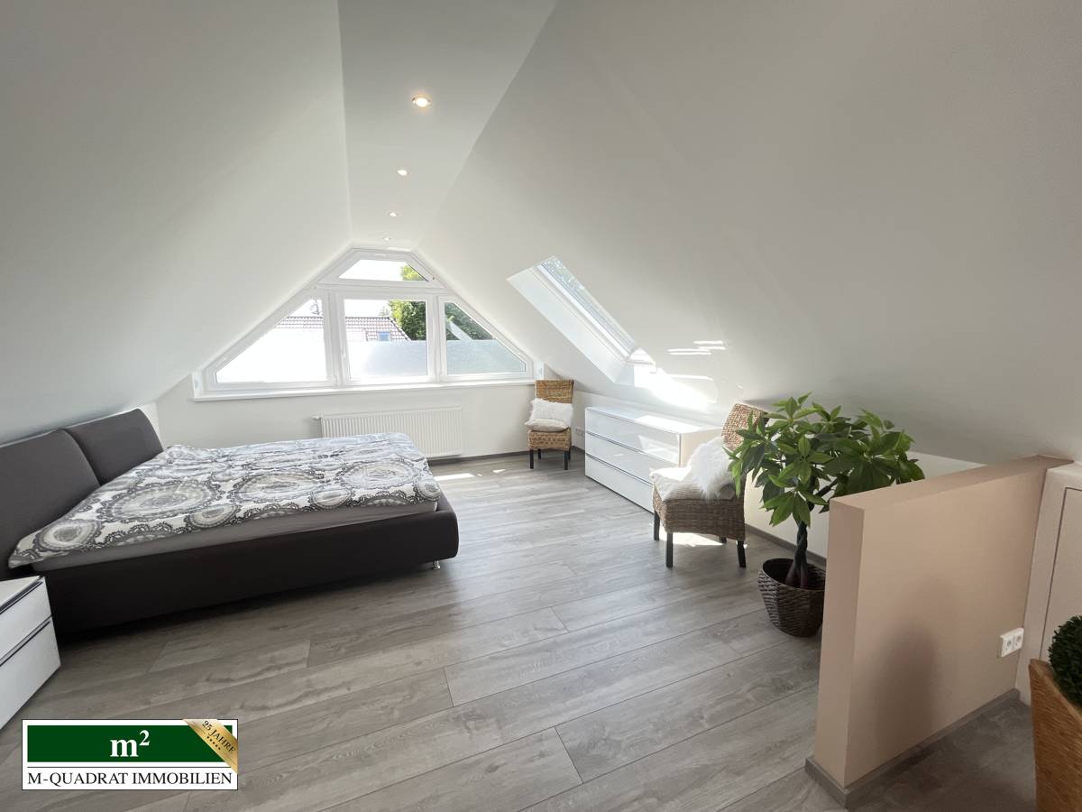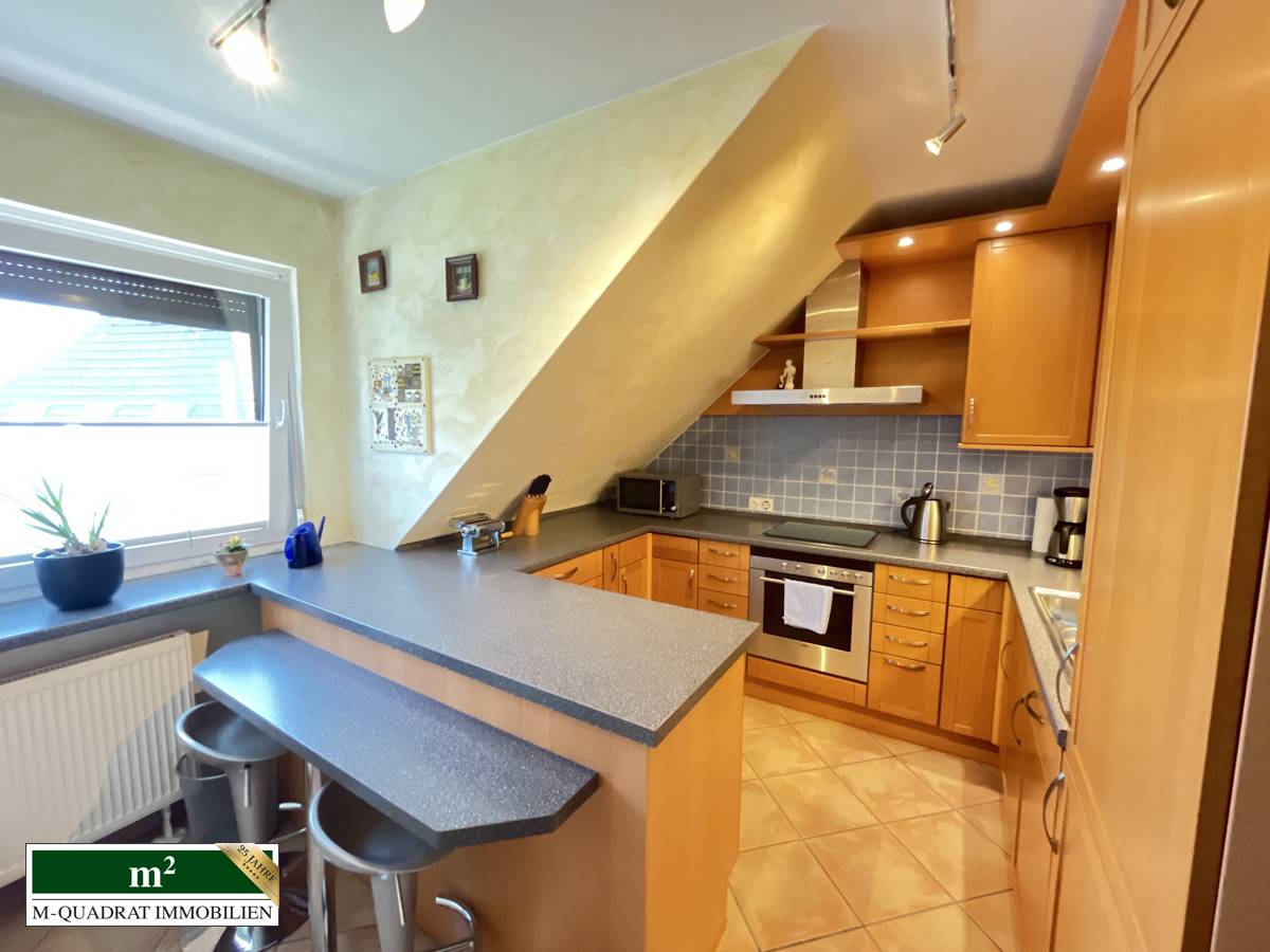 Bevor sie die Dachgeschosswohnung betreten, empfängt sie ein offener Vorflur. Hier können Jacken und Schuhe ihren Platz finden. Auf dieser Etage befindet sich ein Zimmer, eine individuell gestaltete „Nobilia“ Küche, ein älteres Wannenduschbad sowie ein großzügiges, einladendes und helles Wohnzimmer, das offen zum Esszimmer ist. Für diese Bereiche wurden „Shelly-Schalter“ installiert. Diese ermöglichen eine Schaltung und Steuerung des Lichts und der Außenrollläden vorm Balkon, über eine APP. Vom Esszimmer aus kommen sie auf den ca. 5 m² großen West-Balkon, der 2020 saniert wurde. Eine neuwertige Treppe führt sie in den ausgebauten Spitzboden mit eigenem, modernem Duschbad. Im Zuge des Ausbaus wurde die Dachdämmung mit 160er Dämmung verstärkt.
