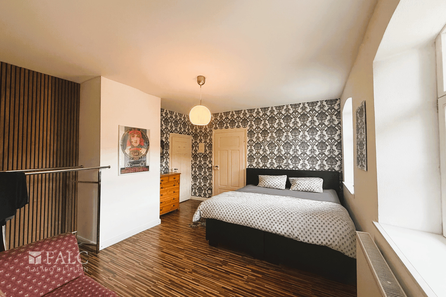 • Schlafzimmer mit Laminatboden über Massivholzboden verlegt