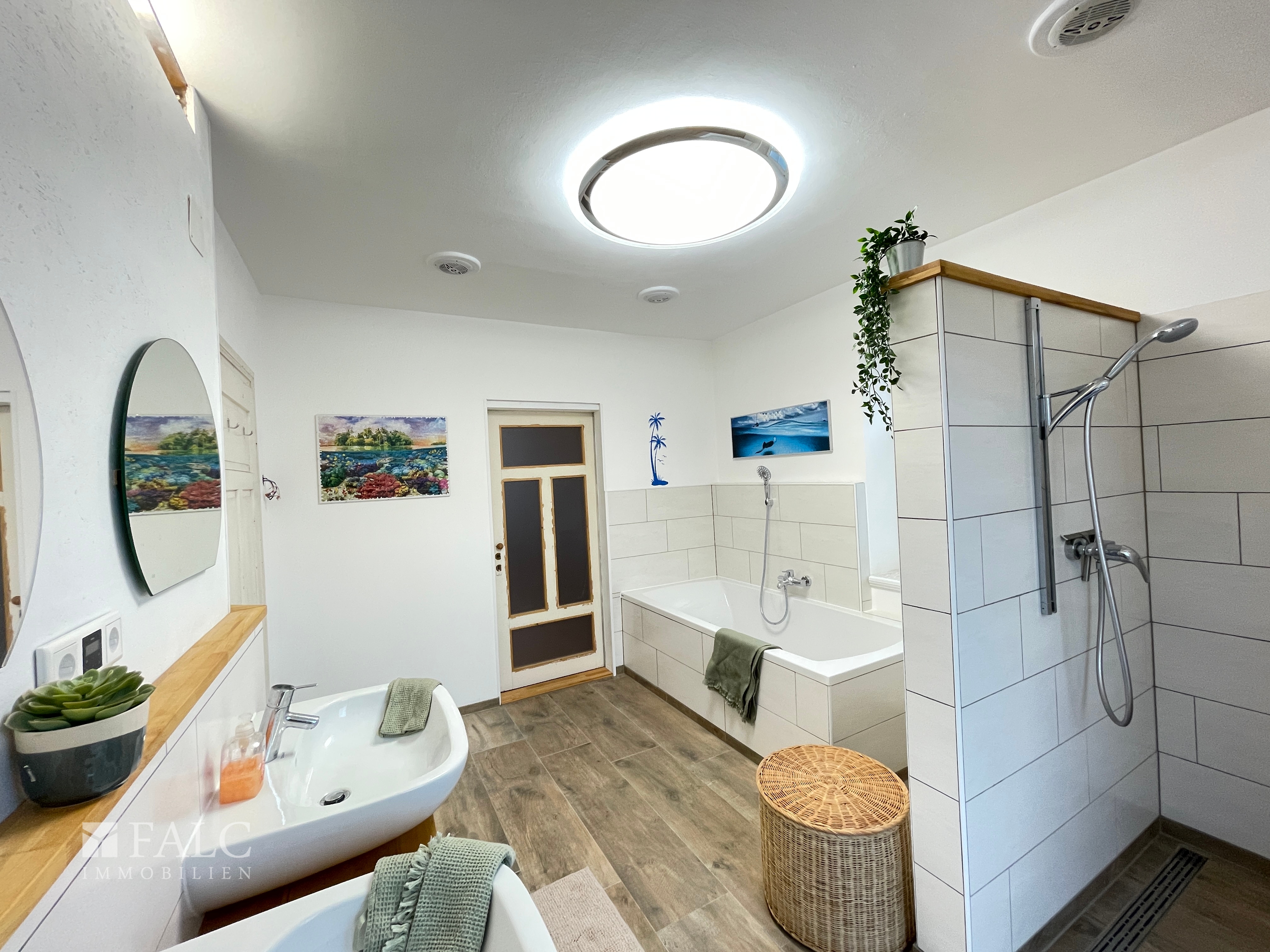 • Gefliestes Tageslichtbad mit Badewanne, Dusche, Waschbecken und WC