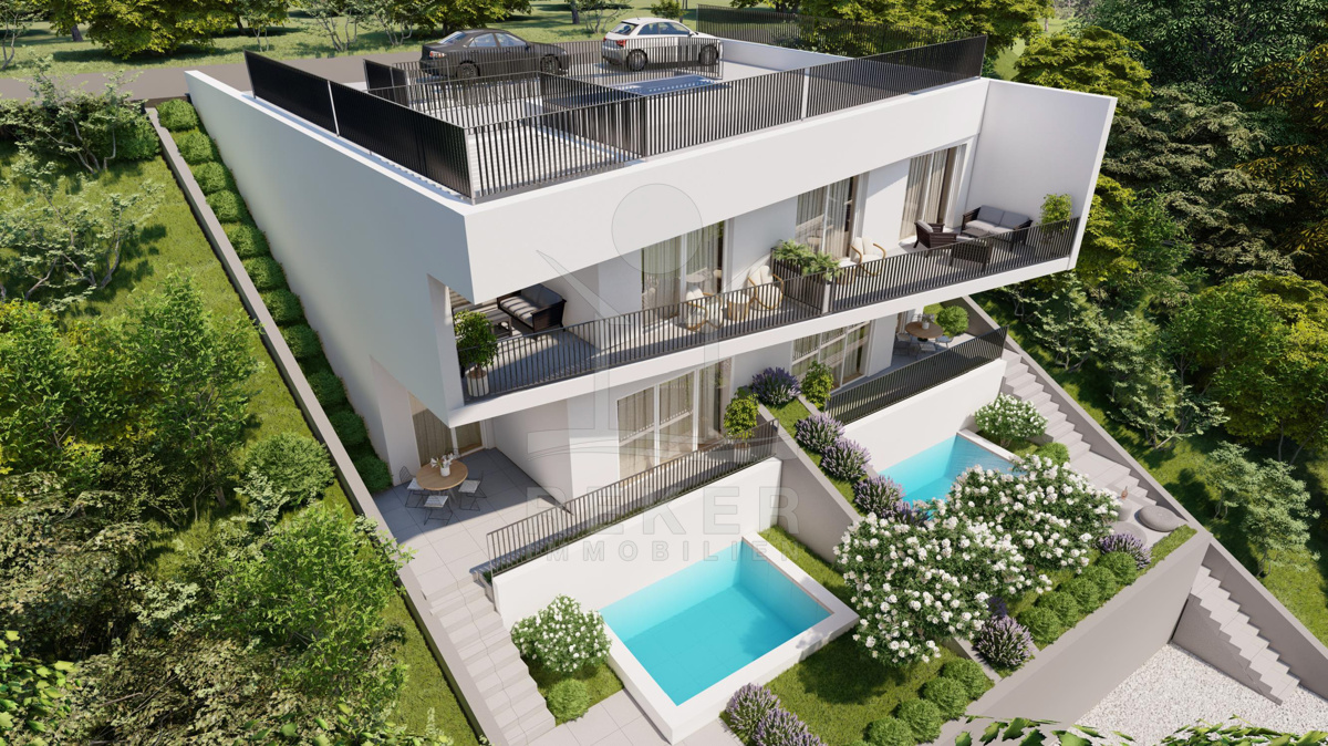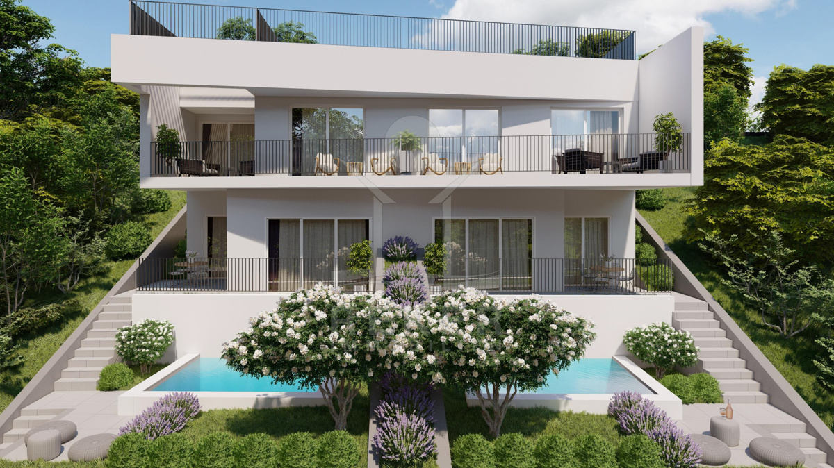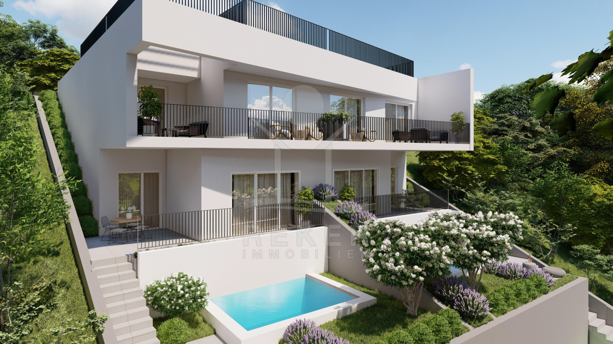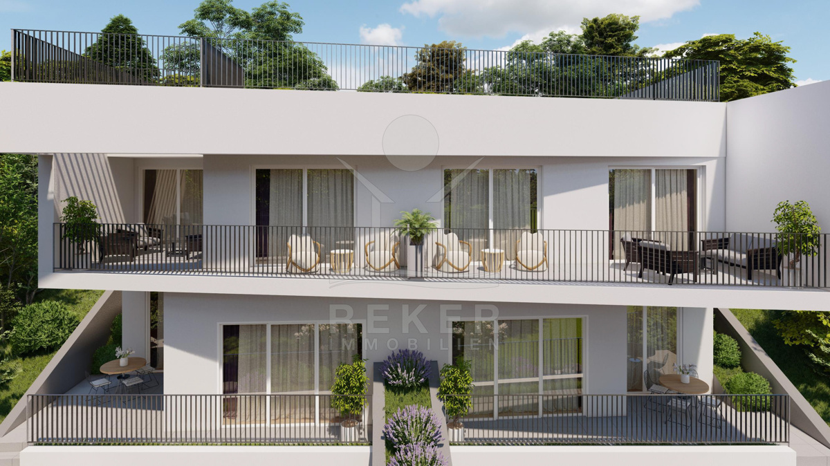 Nur 30 Meter trennen Sie vom Meer, und dennoch genießen Sie in zweiter Reihe einen unverbaubaren Ausblick. Die Hanglage sichert Ihnen freie Sicht auf die Küste. Zwei Schlafzimmer mit direktem Terrassenzugang unterstreichen die Qualität dieses Neubaus mit Fertigstellung 2026.