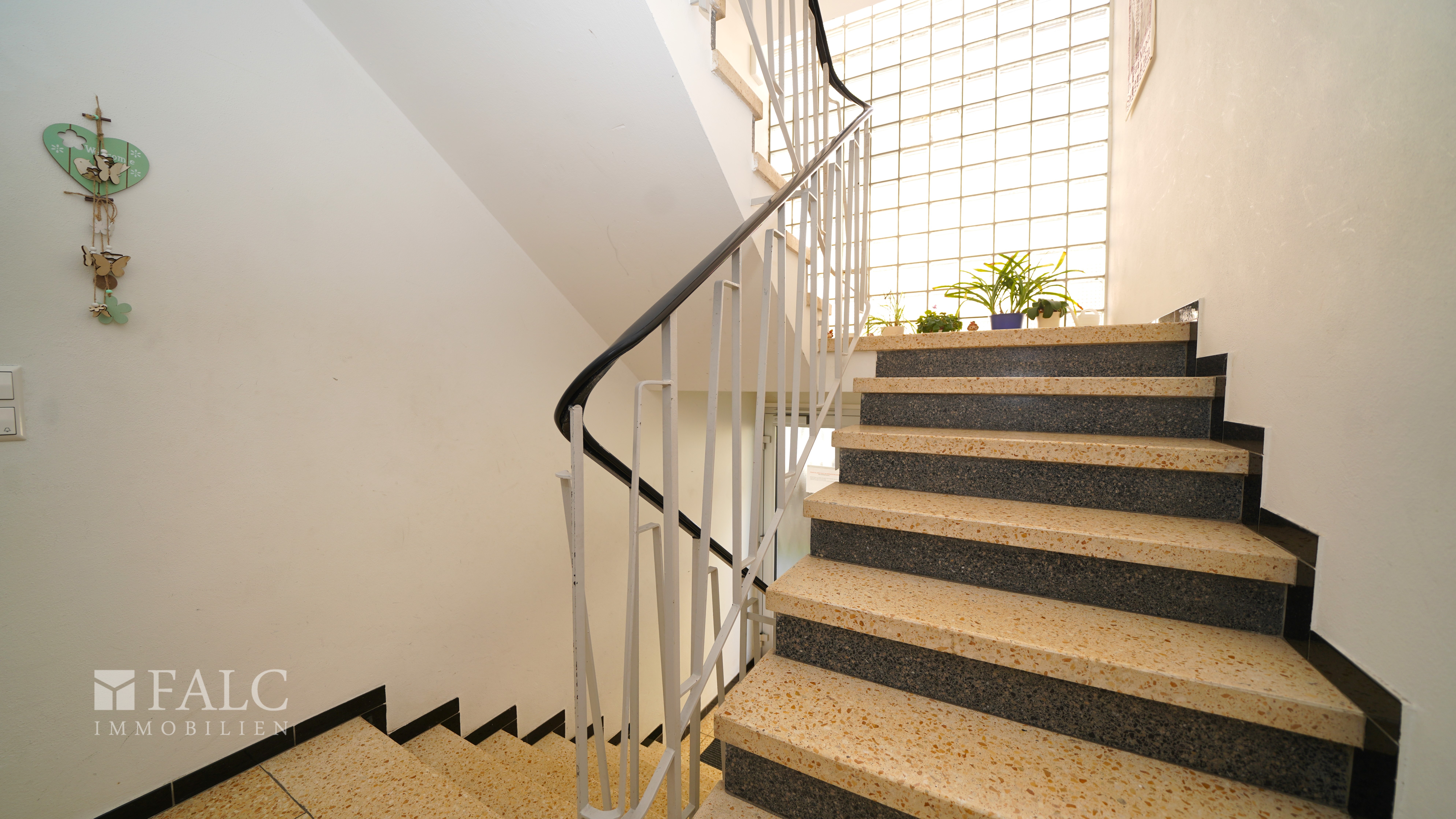 Über einen einladend überdachten Eingangsbereich betreten Sie die linke Haushälfte und gelangen in ein helles, freundliches Treppenhaus, das Sie bereits beim Eintreten willkommen heißt.