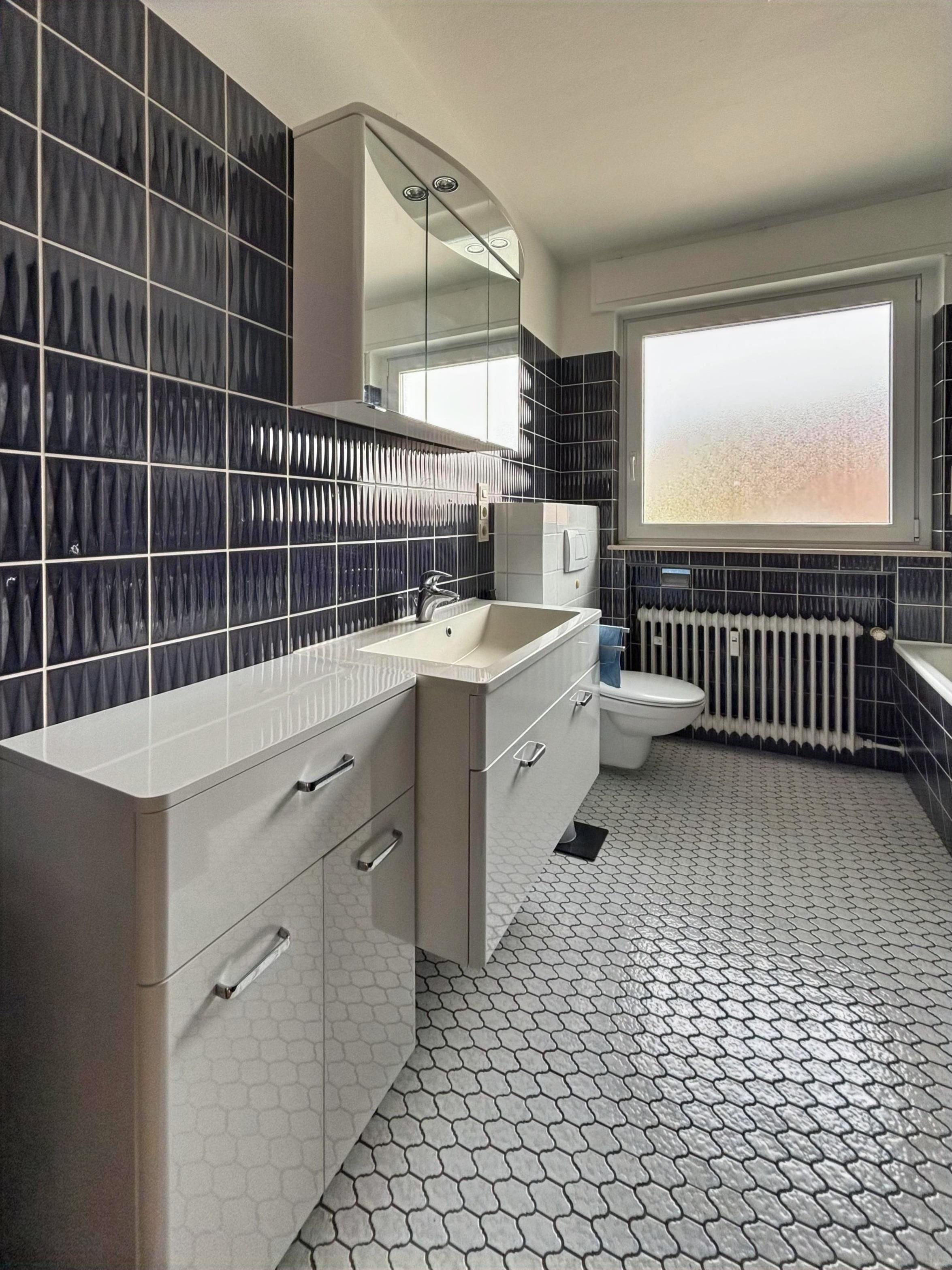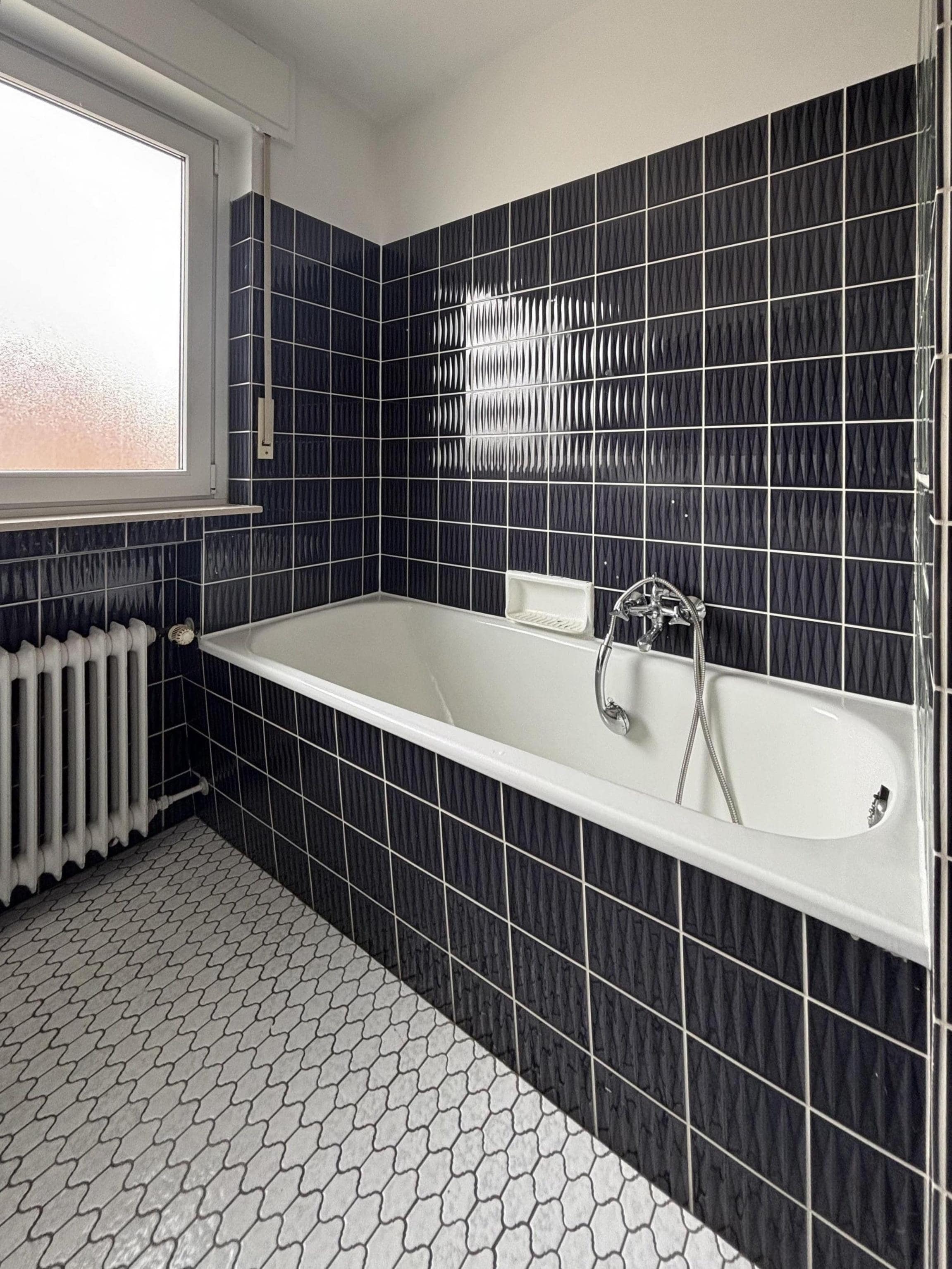 Das Tageslichtbad punktet mit Retro-Charme, Wanne, Dusche und geschmackvollen Fliesen.