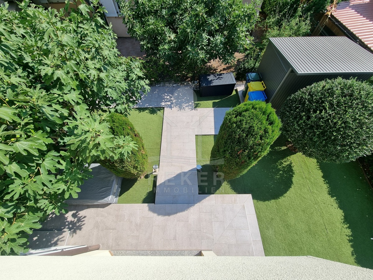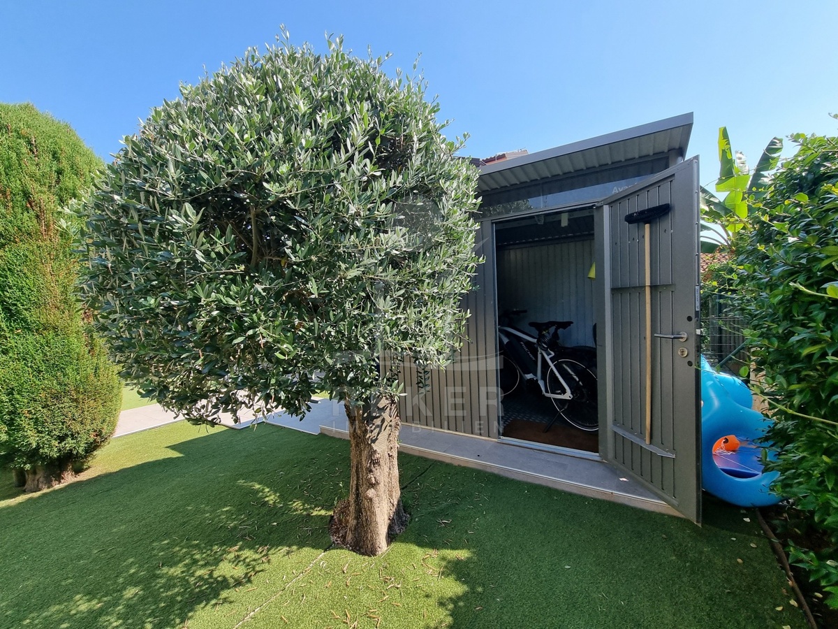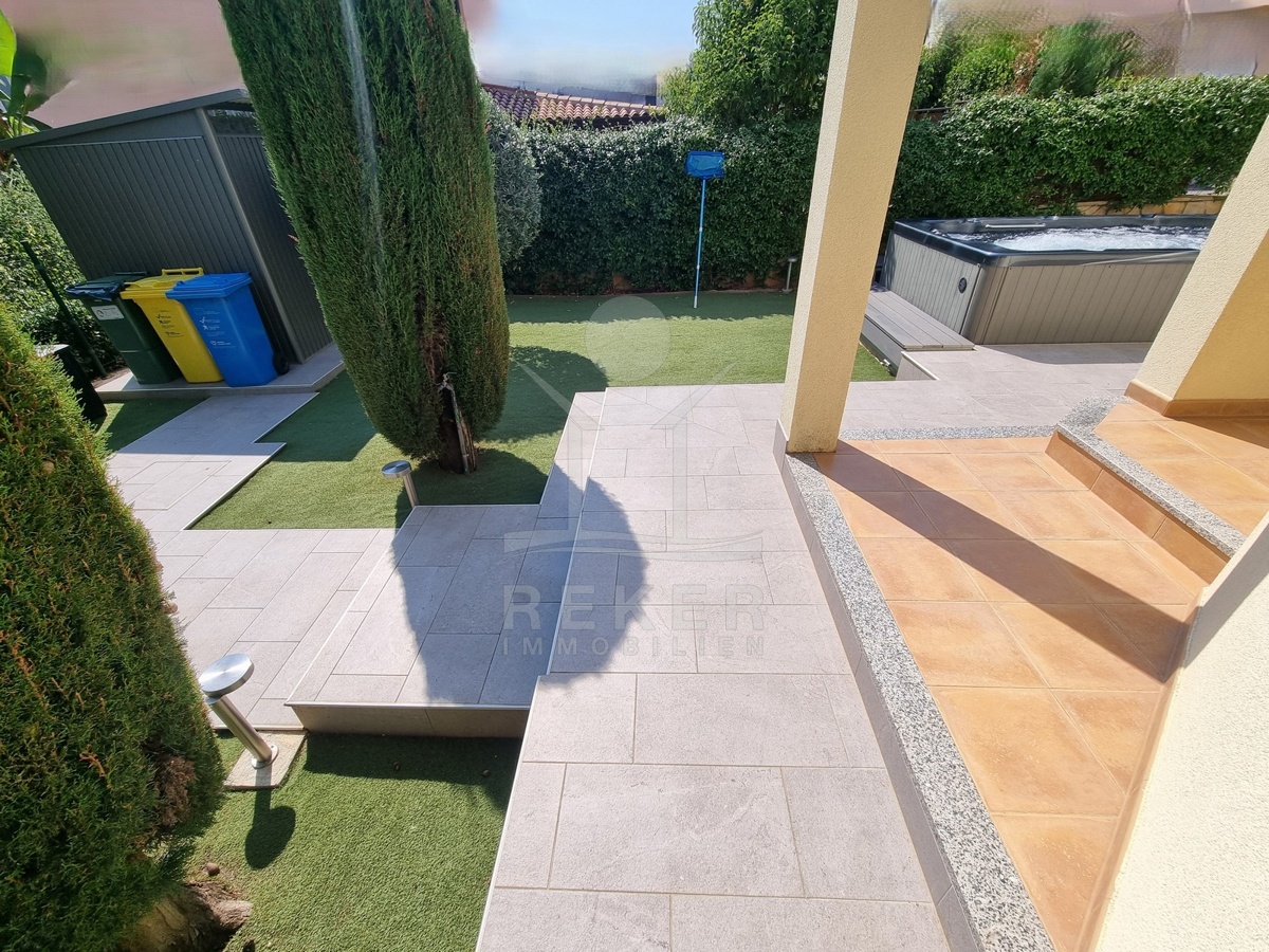 Das Grundstück mit 142,5 m² ist liebevoll angelegt. Ein Oliven- und ein Feigenbaum schaffen mediterranes Flair. Dazu eine sonnige Sitzecke und eine überdachte Terrasse mit Sommerküche, gut geeignet für Mahlzeiten im Freien. Für erholsame Momente steht im Garten ein großer Jacuzzi bereit, abgeschirmt und mit viel Privatsphäre. Ein kleines Gartenhaus sorgt für Stauraum.