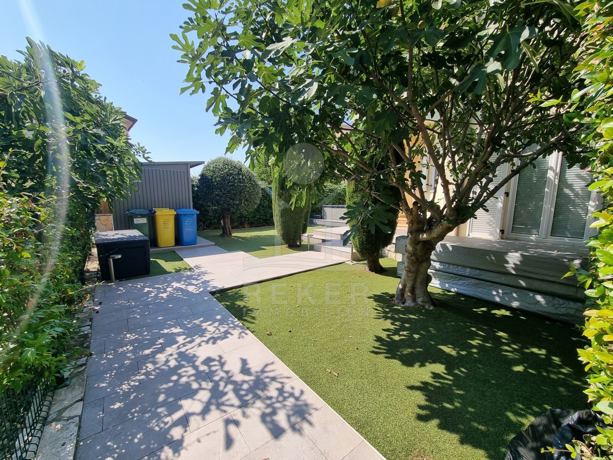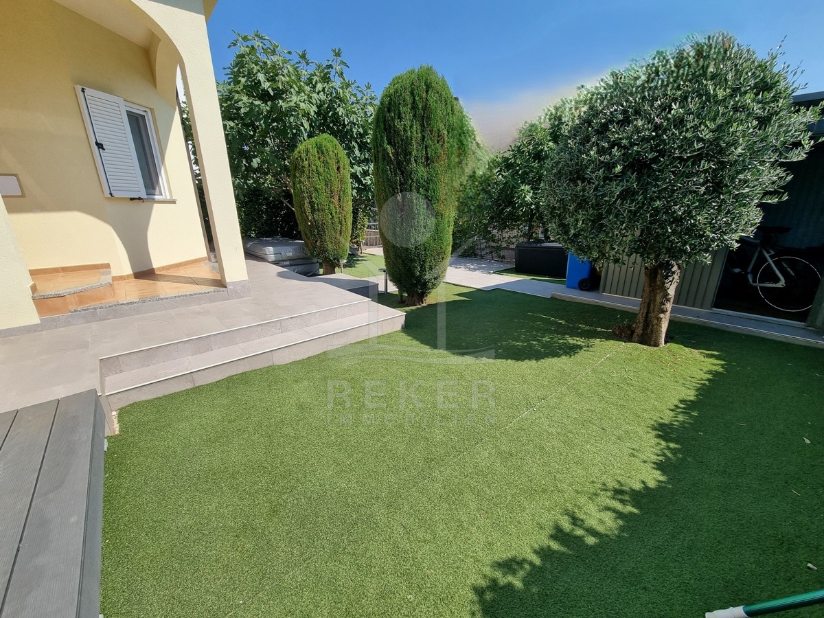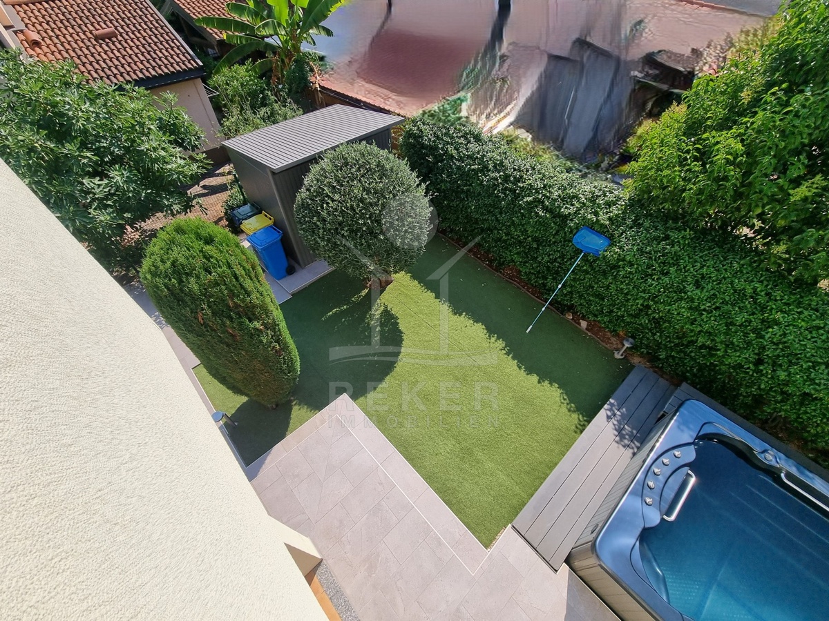 Das Grundstück mit 142,5 m² ist liebevoll angelegt. Ein Oliven- und ein Feigenbaum schaffen mediterranes Flair. Dazu eine sonnige Sitzecke und eine überdachte Terrasse mit Sommerküche, gut geeignet für Mahlzeiten im Freien. Für erholsame Momente steht im Garten ein großer Jacuzzi bereit, abgeschirmt und mit viel Privatsphäre. Ein kleines Gartenhaus sorgt für Stauraum.