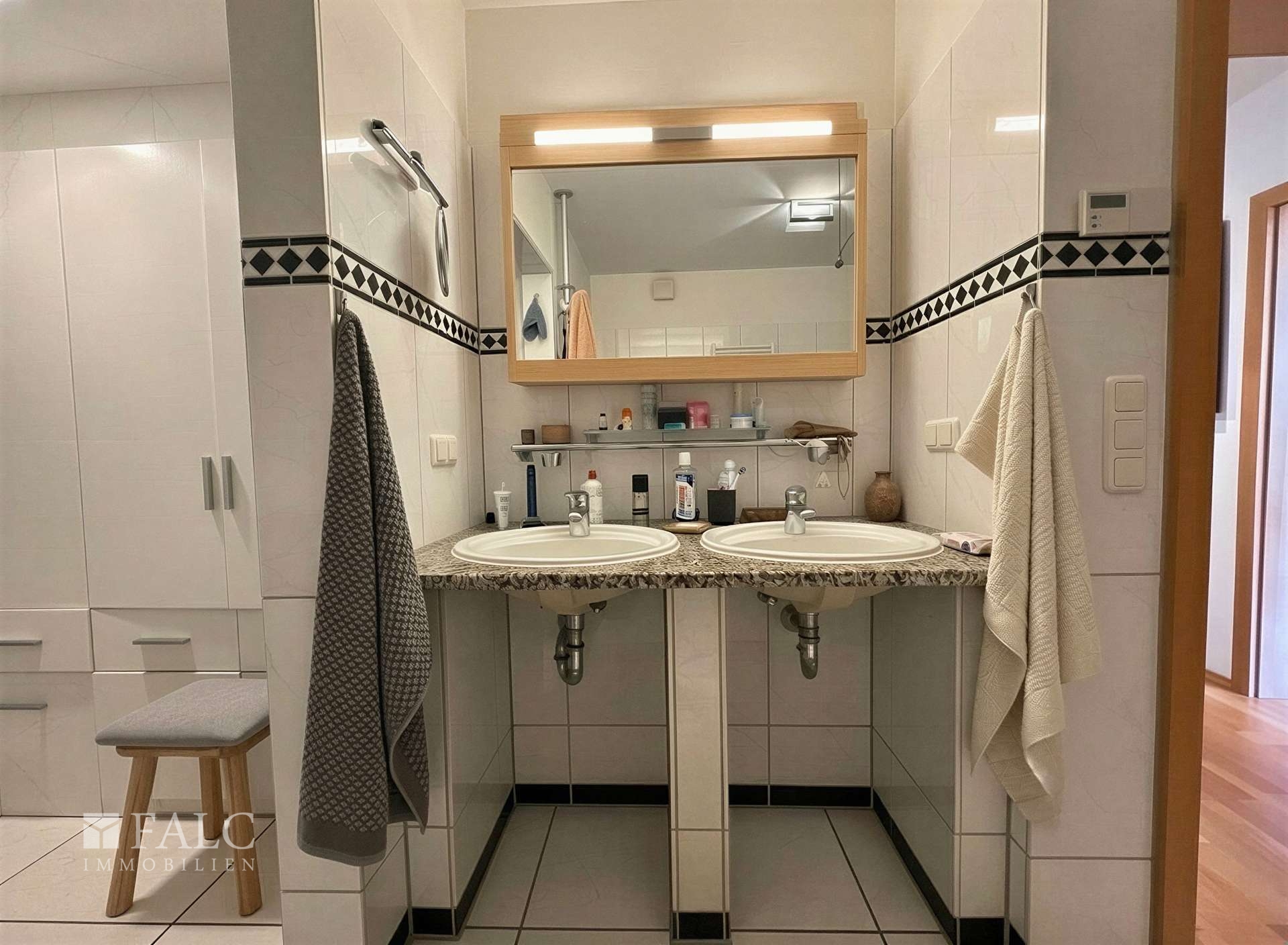 Das komfortable Wohnbad ist mit Eckbadewanne, separater Regendusche, Bidet und Doppelwaschtisch ausgestattet. Innerhalb des Badbereichs befindet sich zudem ein separater Raum, der bereits für den Einbau einer Sauna vorbereitet ist und sich ideal als privater Wellnessbereich nutzen lässt. Ergänzt wird die Wohnung durch ein zusätzliches Gäste-WC.