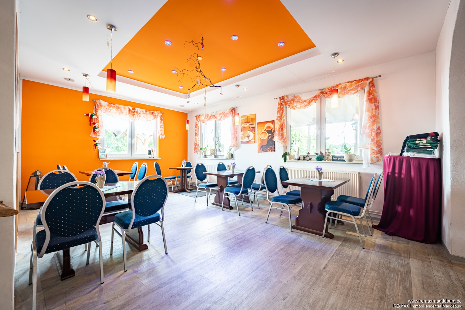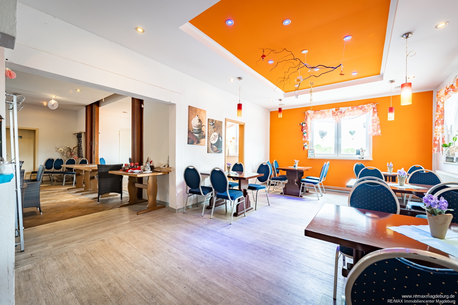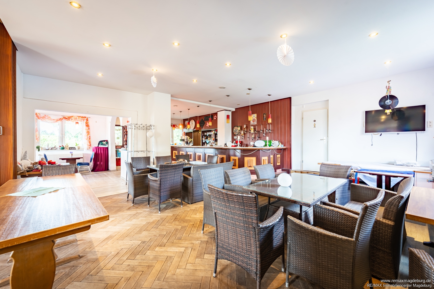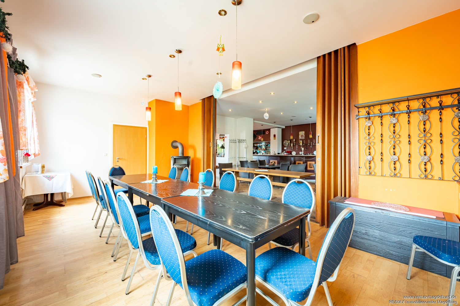 Im Innenbereich stehen drei miteinander verbundene Gasträume zur Verfügung, die eine flexible Nutzung ermöglichen. Ob klassisches Restaurant, Themen-Gastronomie, Vereinsgaststätte oder Eventlocation – die zusammenhängende Bewirtungsfläche erlaubt unterschiedliche Bestuhlungs- und Nutzungskonzepte. Die offene und gut strukturierte Raumaufteilung unterstützt effiziente Serviceabläufe und schafft eine angenehme Atmosphäre für Gäste.