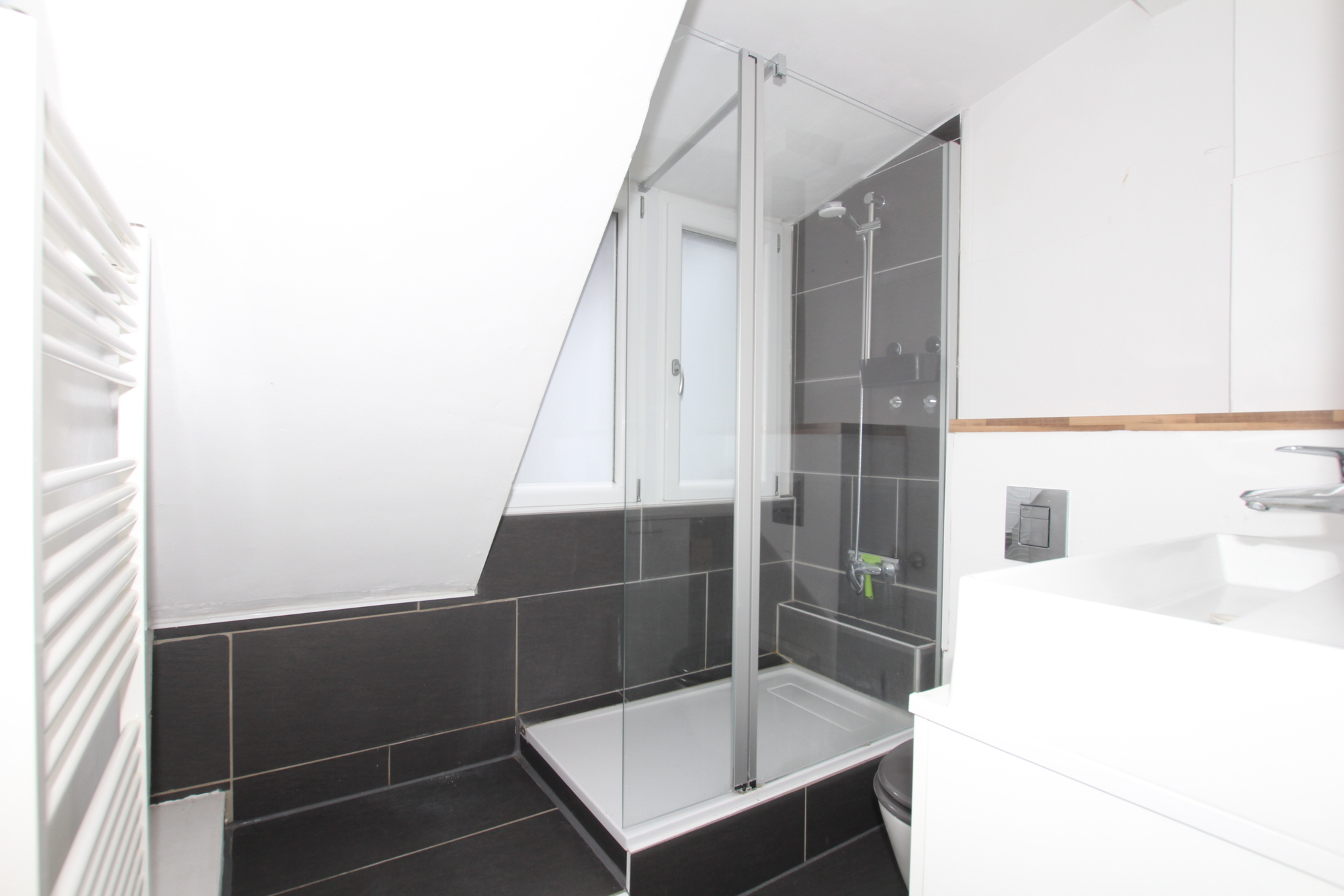 Das ca. 2015 sanierte Tageslicht Duschbad wurde modern und komfortabel ausgestattet, mit einer Walk-In-Dusche, einem Hänge-WC, einer Handtuchhalterheizung sowie einem Waschbecken.