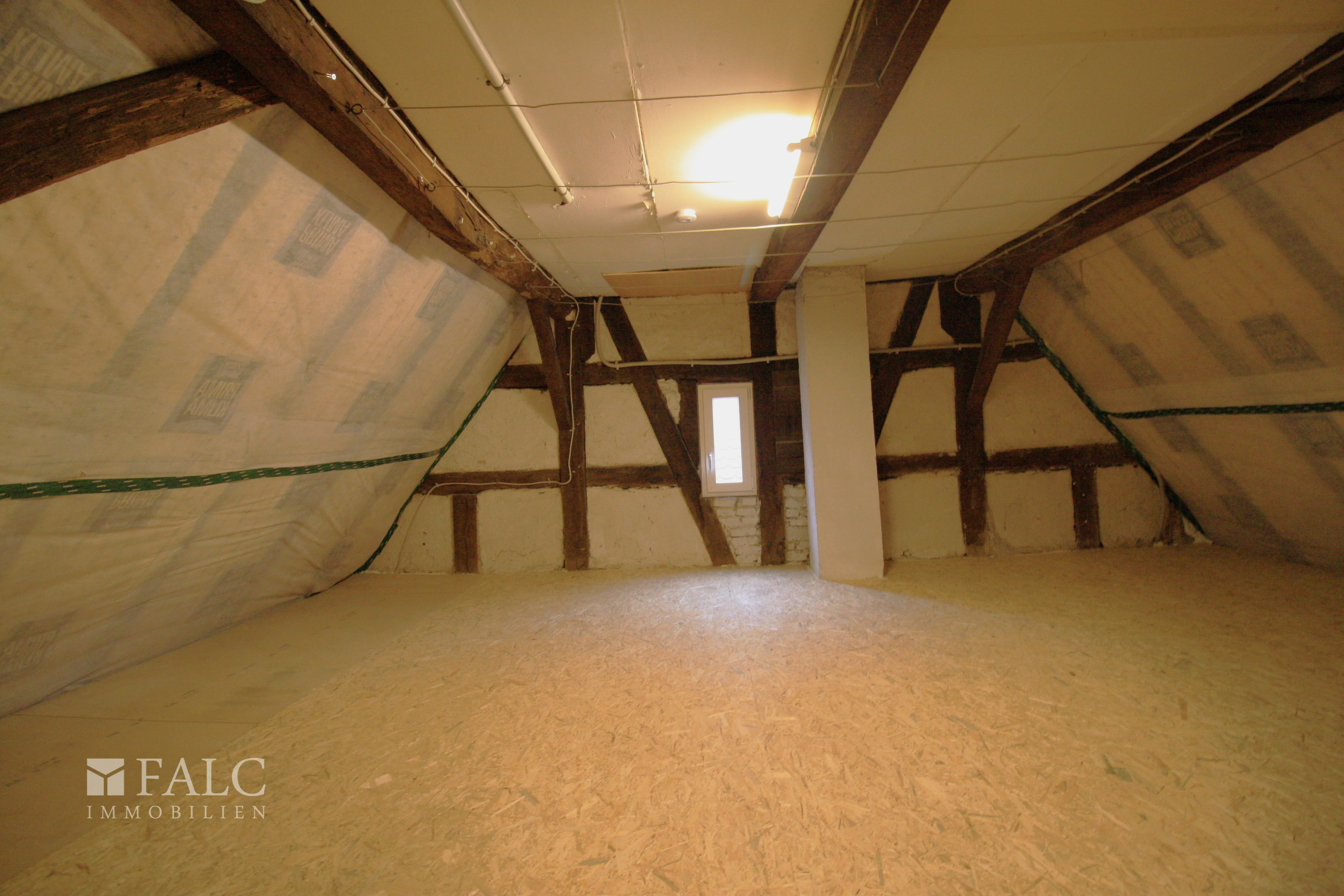 Ein besonderes Highlight ist der ausgebaute Spitzboden: Über eine Treppe erreichbar, erwartet Sie hier ein weiteres Zimmer mit sichtbaren Holzbalken, das sich ideal als Schlaf-, Arbeits- oder Gästezimmer eignet. Zusätzlich steht im Dachgeschoss ein separater Abstellraum mit großzügiger Fläche zur Verfügung.