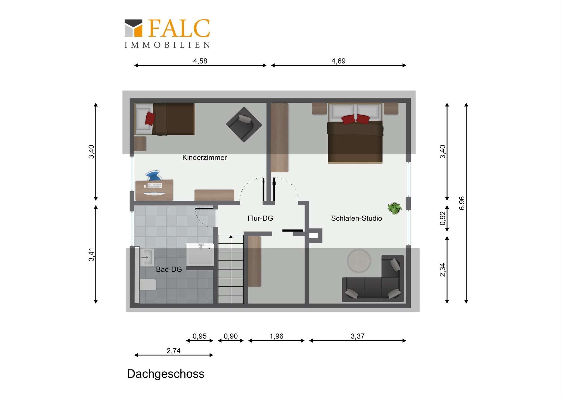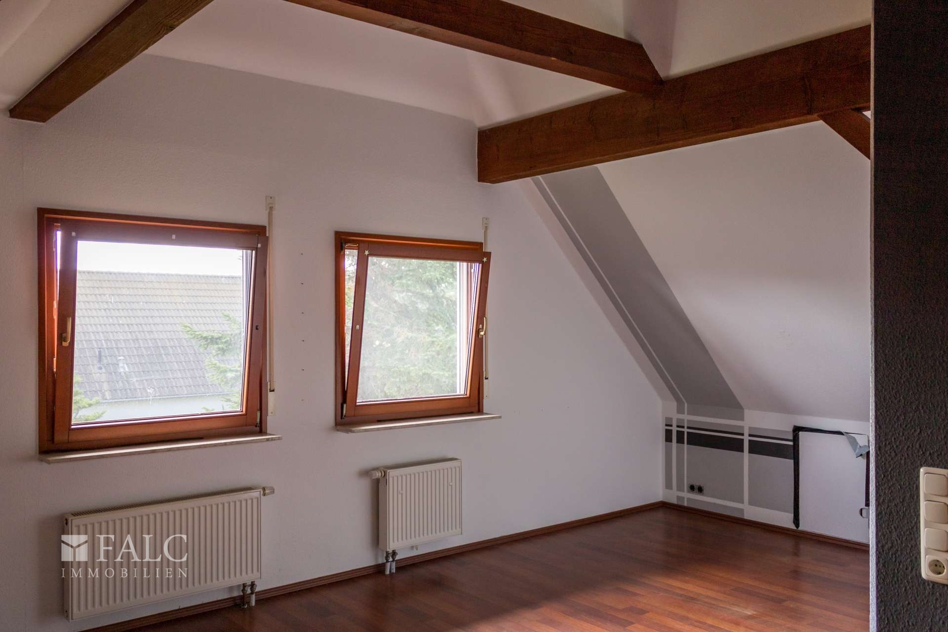 Weiter geht es in das Dachgeschoss, das weitere Schlafzimmer beherbergt. Momentan ist hier ein großes Schlafzimmer/ Studio, welches auch teilbar ist und ein weiteres Schlaf-/ Kinderzimmer. Ein zusätzliches Badezimmer rundet das Raumangebot ab und sorgt für zusätzlichen Komfort.