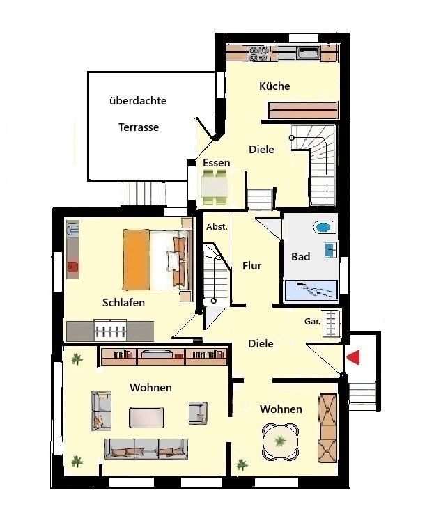 Erdgeschoss mit ca. 75 m² Wohnfläche: Über einen überdachtem Eingangsbereich kommen Sie zur Hauseingangstür und in den Wohnungsflur mit Platz für eine Garderobe. Dahinter liegen auf der linken Seite des Flures zwei helle Wohnräume zur Straßenseite. Zur Rückseite des Hauses liegen ein Schlaf.- Gästeraum, ein Badezimmer mit Fenster, ausgestattet mit Dusche, Handwaschbecken und WC, ein Frühstücksbereich mit Ausgangstür zur überdachten Terrasse und der gepflegte, große Gartenbereich sowie die angebaute Kochküche und der Treppenaufgang zum Obergeschoss.