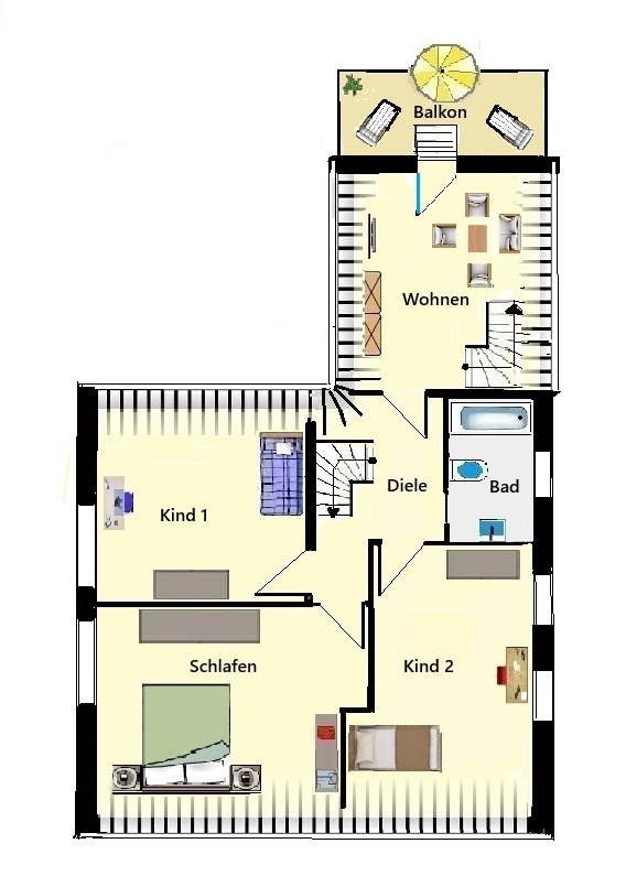 Obergeschoss mit ca. 68 m² Wohnfläche: Über das Treppenhaus geht es in das Obergeschoss. Hier befinden sich ein Elternschlafzimmer und zwei Kinderzimmer, ein Fensterbadezimmer mit Wanne, Handwaschbecken und WC. Durch den Flurbereich können Sie in den Anbaubereich mit einem Wohnraum und Ausgangfenstertür zum Balkon zur Gartenseite gelangen. In allen Räumen befinden sich leichte Dachschrägen.