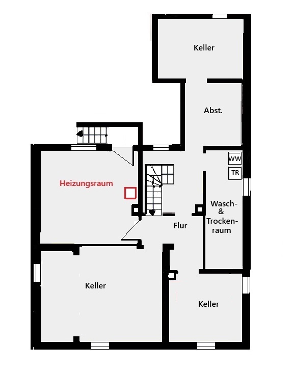 Kellergeschoss voll unterkellert: Hier befinden sich 2 Kellerräume, 1 Heizungskeller und 1 Wasch- und Trockenraum mit Ausgang zur Außentreppe in den Terrassen- und Gartenbereich.