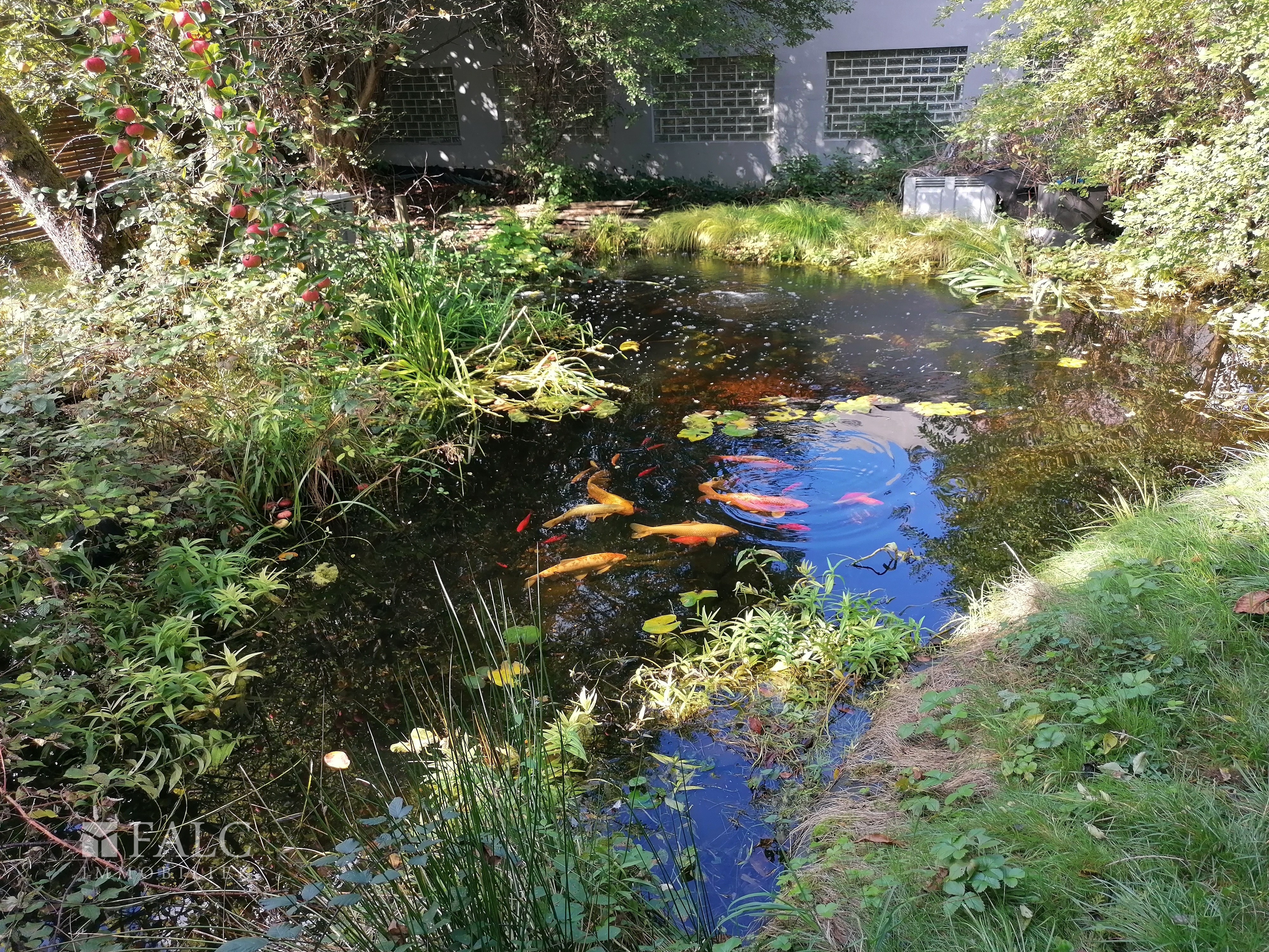 Der grosse Garten ist mit einem Naturteich mit Fischen besetzt. Desweiteren sind Bäume verschiedener Arten vorhanden. Im großen Hof können zwei Freisitze/Carport genutzt werden.