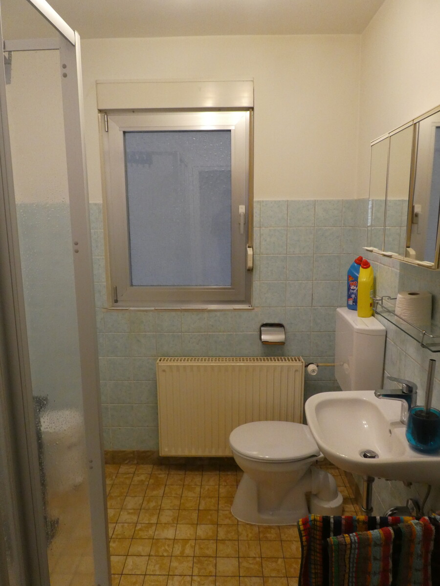 Die Küche ist mit einer Einbauküche ausgestattet und bietet ausreichend Platz für Kochvergnügen und gemeinsame Mahlzeiten. Das Badezimmer ist gepflegt und funktional gestaltet, mit Tageslicht. Ein Keller und eine Speisekammer stehen zur Verfügung.