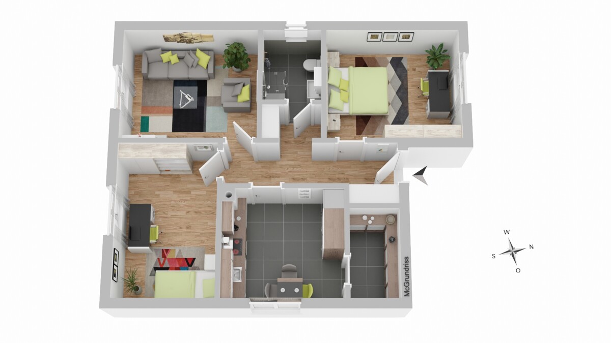Die Wohnung verfügt über drei gut geschnittene Zimmer, die vielseitig nutzbar sind – als Wohn-, Schlaf-, Kinder- oder Arbeitszimmer. Die Fenster sorgen für helle, freundliche Räume und eine angenehme Wohnatmosphäre.