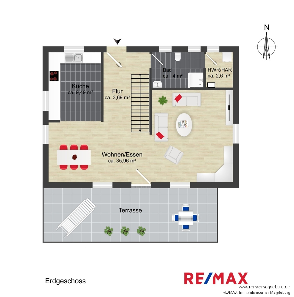 Erdgeschoss: - Flur, - Badezimmer mit Dusche, - Hauswirtschaftsraum, - Wohn- und Esszimmer mit Zugang zur Terrasse, - Küche mit EBK,