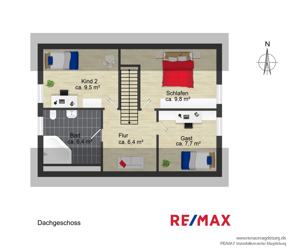 Das Dachgeschoss überzeugt mit einer klaren und gut nutzbaren Aufteilung. Neben einem Schlafzimmer stehen Ihnen zwei weitere Zimmer zur Verfügung, die individuell als Kinder-, Gäste- oder Arbeitszimmer genutzt werden können. Ein freundlich gestaltetes Tageslichtbad mit Badewanne rundet diese Ebene ab und sorgt für zusätzlichen Wohnkomfort.