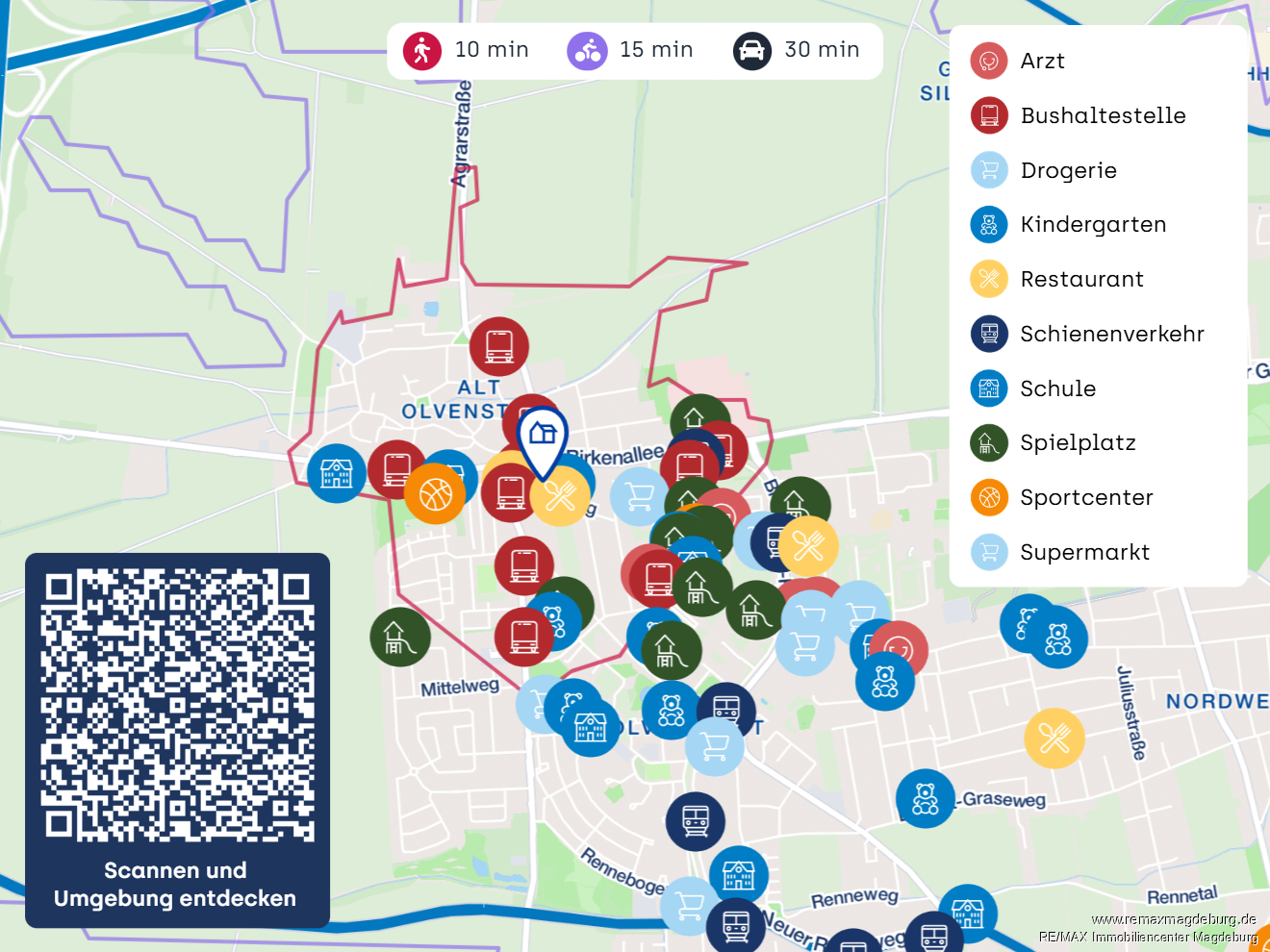 Die Immobilie liegt in einem ruhigen, familienfreundlichen Wohngebiet im Westen Magdeburgs und besticht durch ihre angenehme Nachbarschaft und die naturnahe Umgebung. Grünflächen, Spielplätze und ruhige Straßen bieten ideale Bedingungen für Kinder zum Spielen und Entdecken. Einkaufsmöglichkeiten für den täglichen Bedarf, Schulen und Kindertagesstätten sind in kurzer Entfernung erreichbar, wodurch kurze Wege für Familien gewährleistet sind.