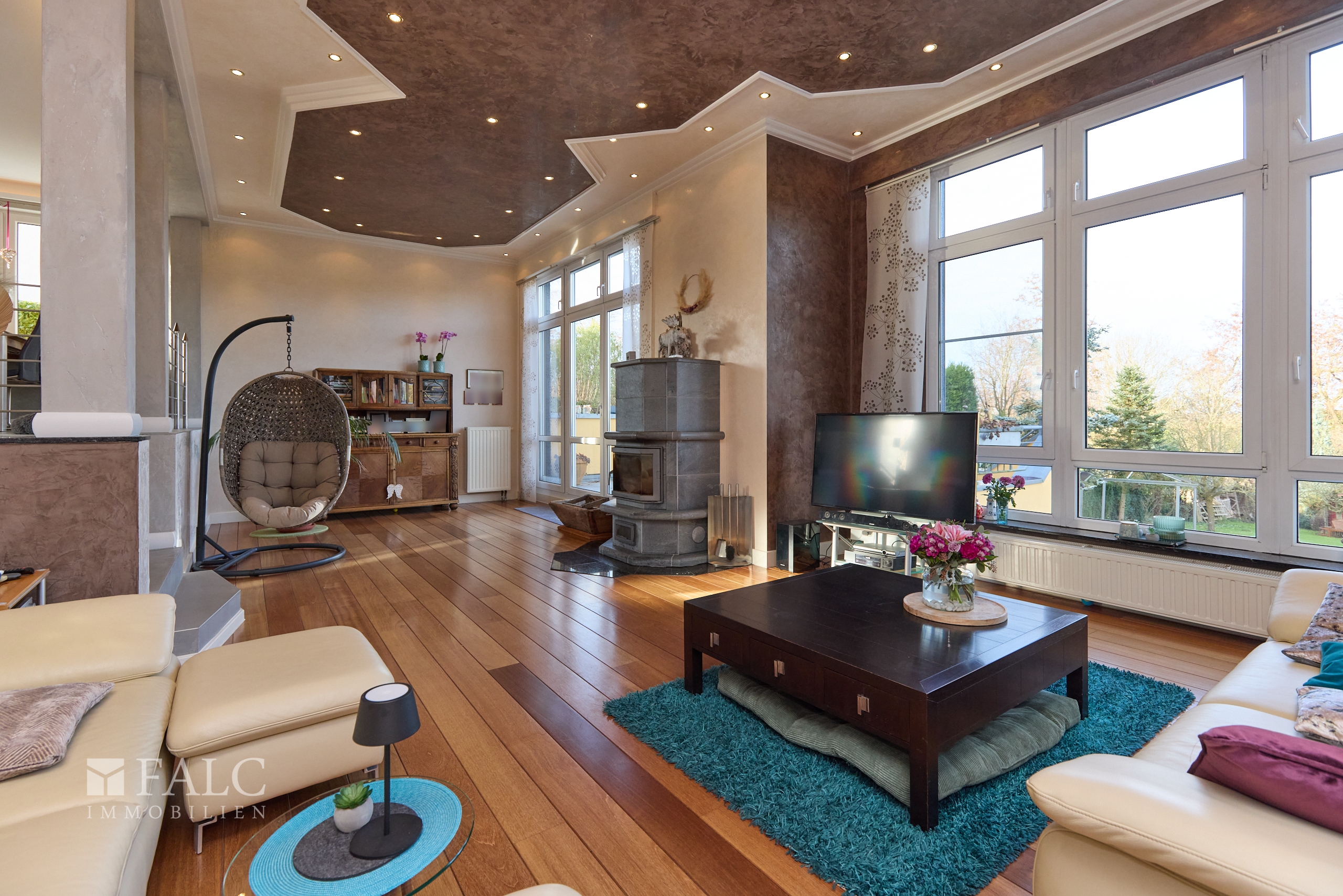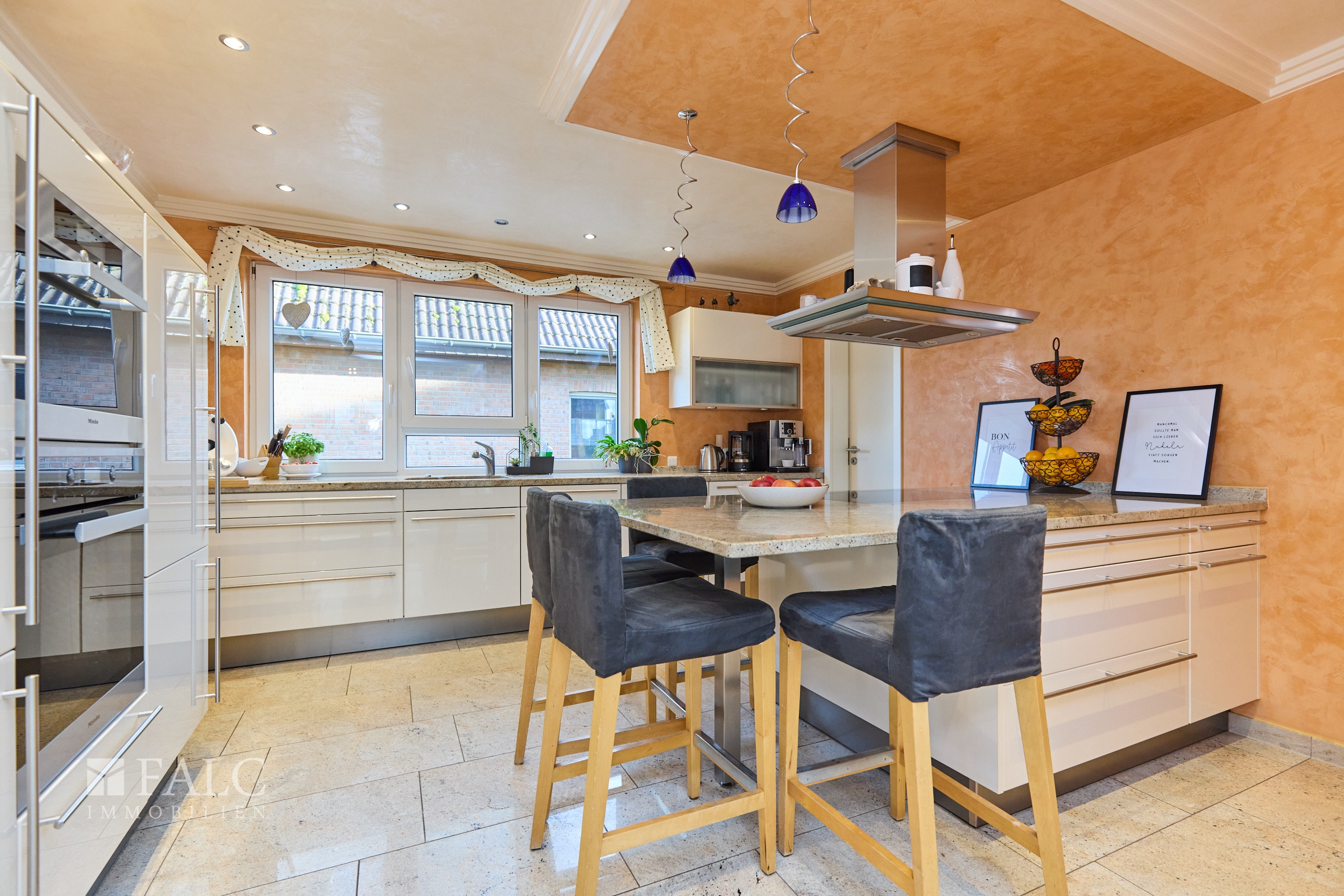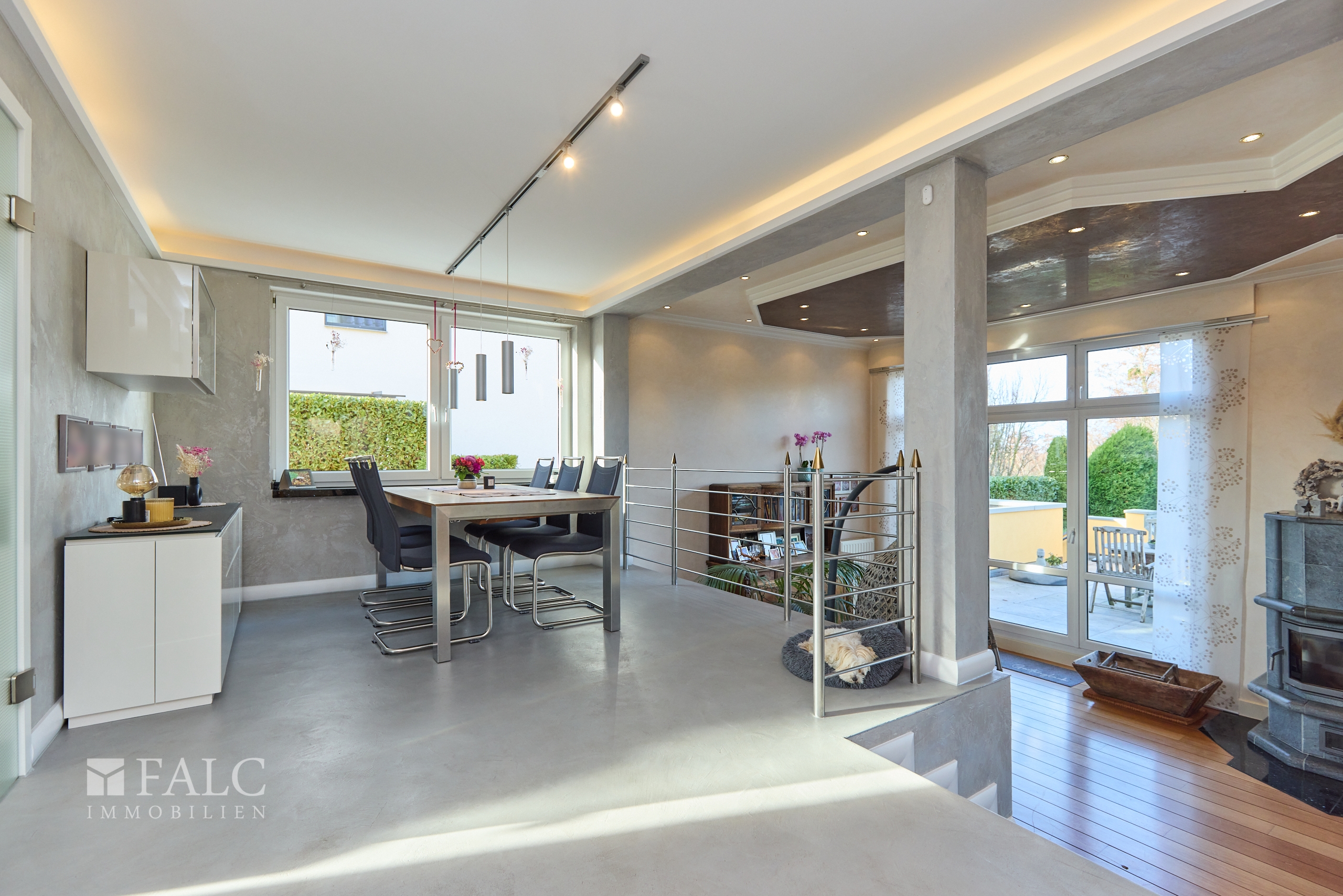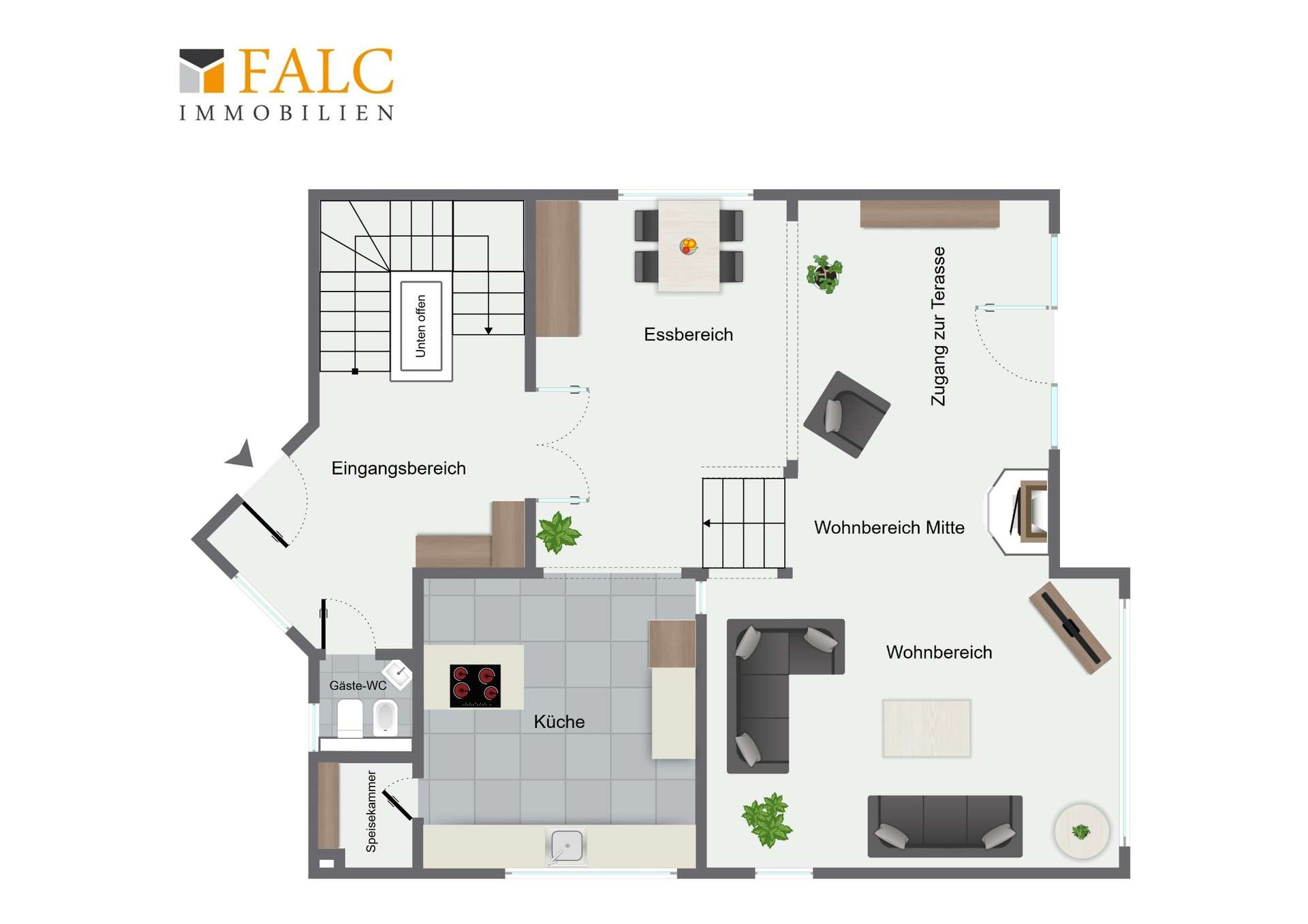 Bereits der offene und lichtdurchflutete Eingangsbereich wird Sie begeistern! Hohe Decken und die elegante Treppe sind ein Highlight - nicht nur für Besucher! Rechter Hand befindet sich ein modernes WC für Ihre Gäste. Geradeaus mündet Ihr Weg in den hellen Koch- / und Essbereich, wobei die Küche rechts vom Essbereich abgetrennt ist. Angrenzend an Ihre Küche finden Sie eine praktische Speisekammer für Ihre Vorräte. Das Besondere am Essbereich ist, dass Ihr Blick über den gesamten Wohnbereich und auch auf den Garten fällt. Gehen Sie wenige Stufen hinunter und Sie befinden sich im äußerst großzügigen Wohnbereich mit über 40 Quadratmetern Fläche. Hier ist Platz für eine ausladende Sitzgruppe sowie einen zweiten Bereich um den Kamin herum. Von hier aus gelangen Sie auch auf die Terrasse und in den Garten.