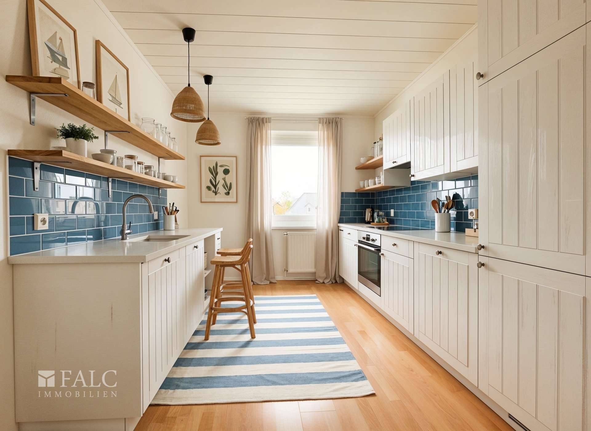 Zurück im Flur, führt der Weg weiter in die Küche. Diese ist funktional gestaltet und bietet genügend Platz für alle notwendigen Küchengeräte. Die Fenster sorgen für eine angenehme Belüftung und Helligkeit.