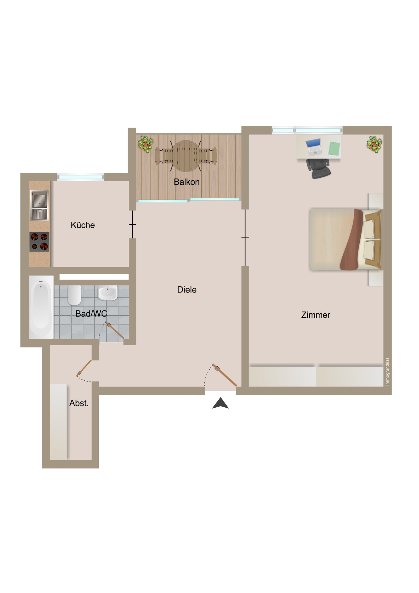 HausflurEssbereichEssbereichKücheKücheWohnen und SchlafenWohnen und SchlafenWohnen und SchlafenBadezimmerAussichtGrundrissAußenansicht