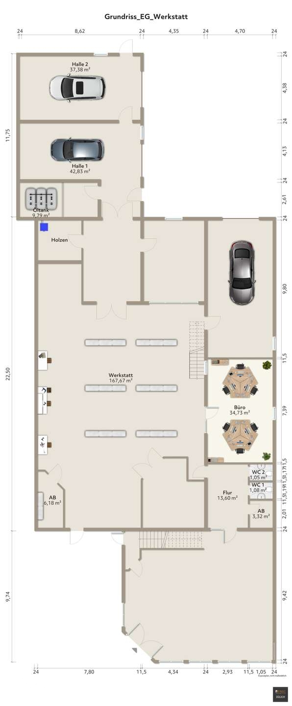 - Wohnfläche: 535 m² - Gewerbefläche: 935 m² - Grundstück mit einer Fläche von 2787 m² - 14 Zimmer - Baujahr: 1970 - Energieeffizienzklasse: C - Balkon vorhanden - Garten vorhanden - Gäste-WC vorhanden - Kaufpreis: 1.399.000 € - Stellplätze vorhanden - Drohnenansicht zeigt großzügige Parkmöglichkeiten - Zugang über ein Treppenhaus - Außenbereich mit Terrasse - Werkstatt und Empfangsbereich vorhanden
