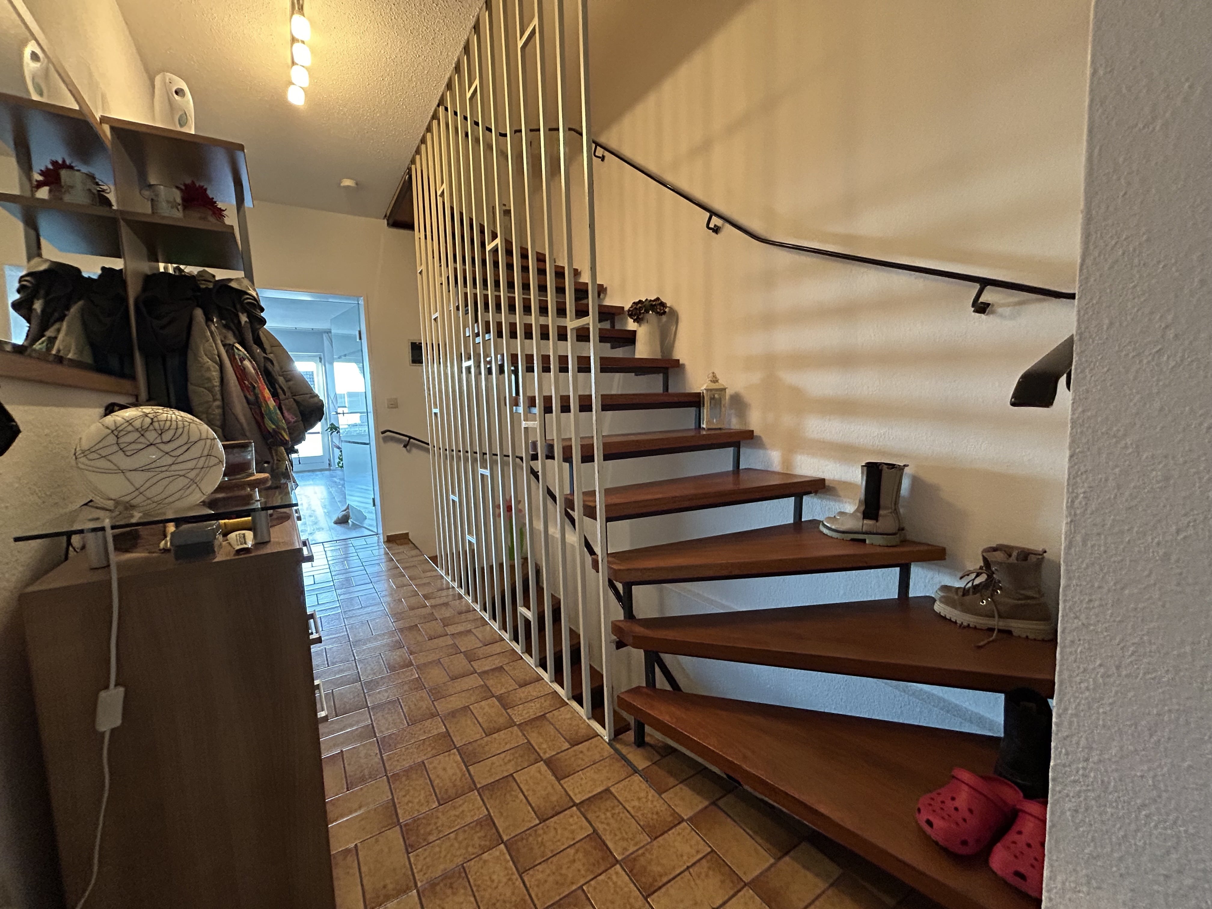 Die Wohnfläche von ca. 112 m² verteilt sich harmonisch auf zwei Wohnebenen und bietet ein behagliches Zuhause mit viel Platz zum Wohlfühlen. Bereits beim Betreten des Hauses wird deutlich, dass hier Wohnkomfort und Gemütlichkeit im Mittelpunkt stehen.