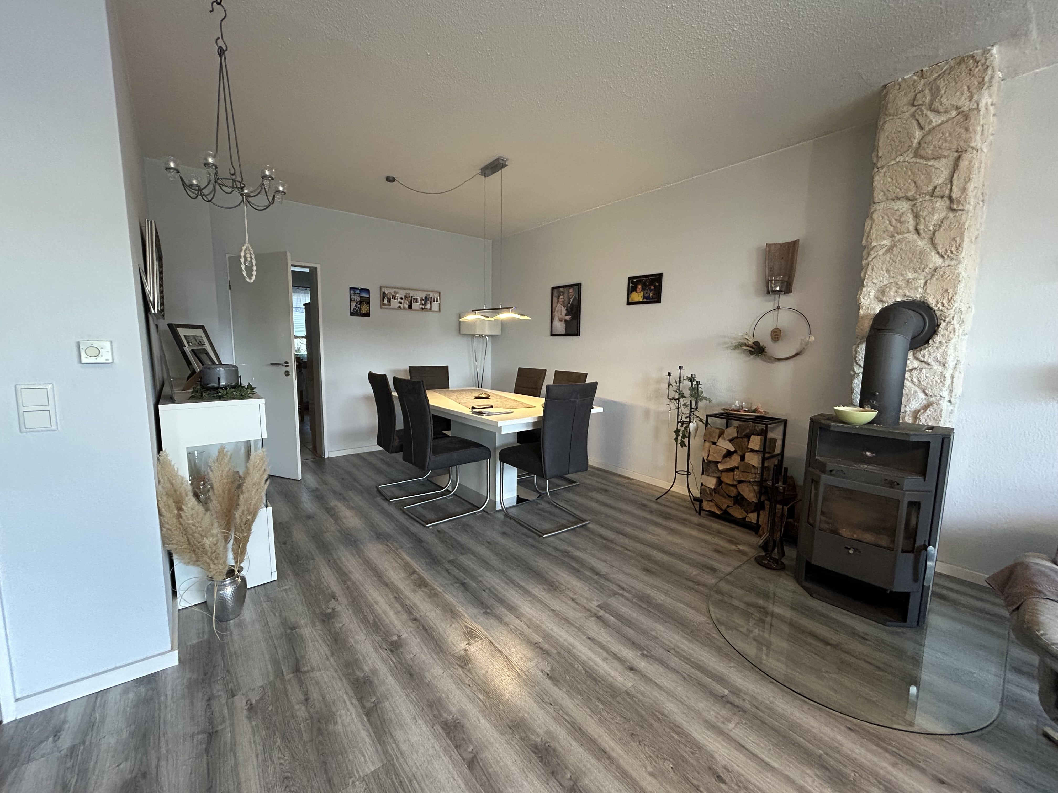 Im Erdgeschoss erwartet Sie eine großzügige Einbauküche, die ausreichend Raum für gemeinsames Kochen und Verweilen bietet. Das geräumige Wohn- und Esszimmer bildet das Herzstück des Hauses. Große Fensterflächen sorgen für viel Tageslicht und eine angenehme Wohnatmosphäre. Ein Kamin lädt besonders an kalten Wintertagen zu gemütlichen Stunden ein. Ergänzt wird diese Ebene durch ein praktisches Gäste-WC.