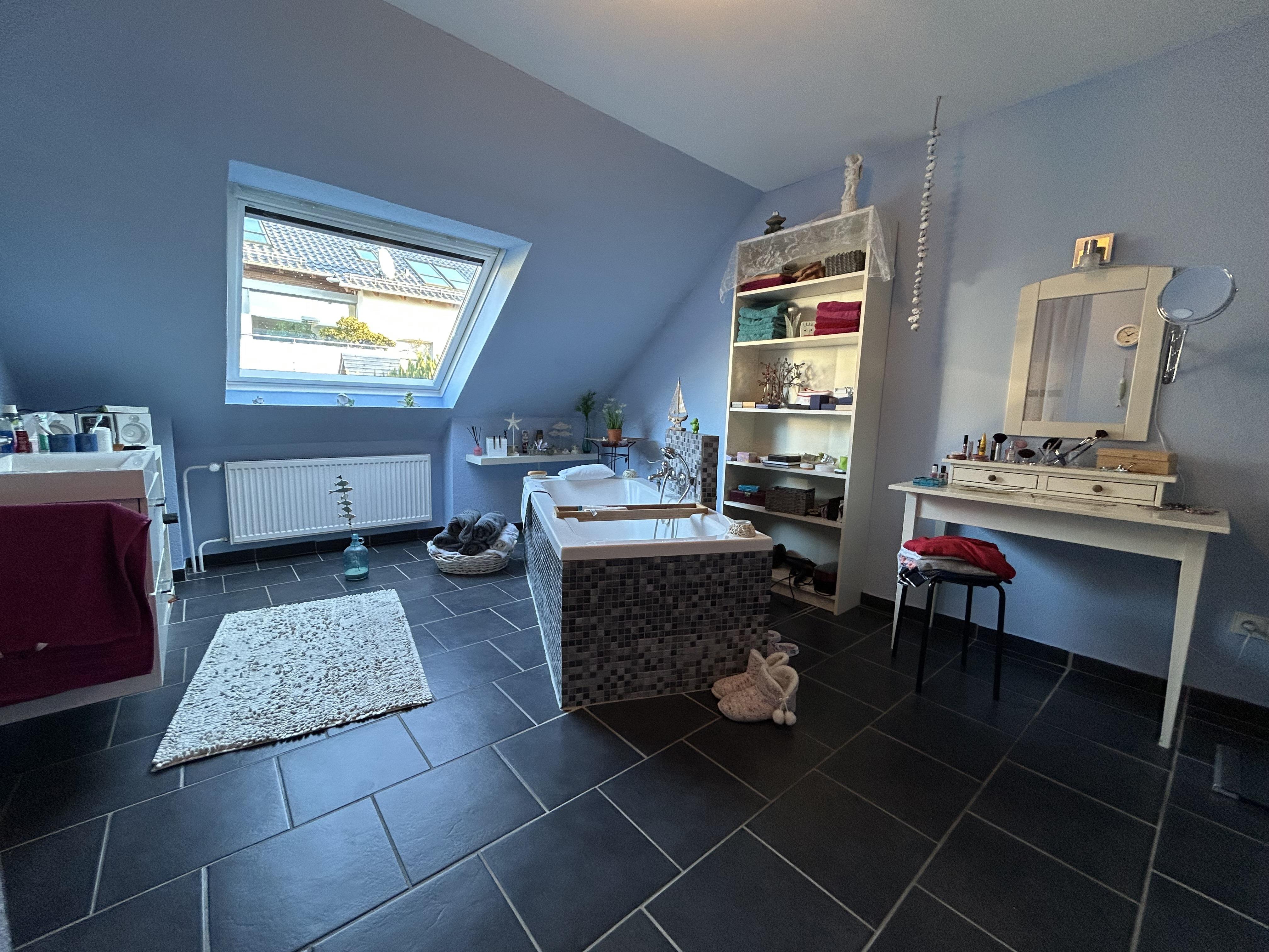 Das Obergeschoss beherbergt zwei gut geschnittene Schlafzimmer, die flexibel als Schlaf-, Kinder- oder Arbeitszimmer genutzt werden können. Ein besonderes Highlight des Hauses ist das großzügige Badezimmer: Die freistehende Badewanne verleiht dem Raum einen modernen, fast schon luxuriösen Charakter und macht das tägliche Bad zu einem kleinen Wellnessmoment.