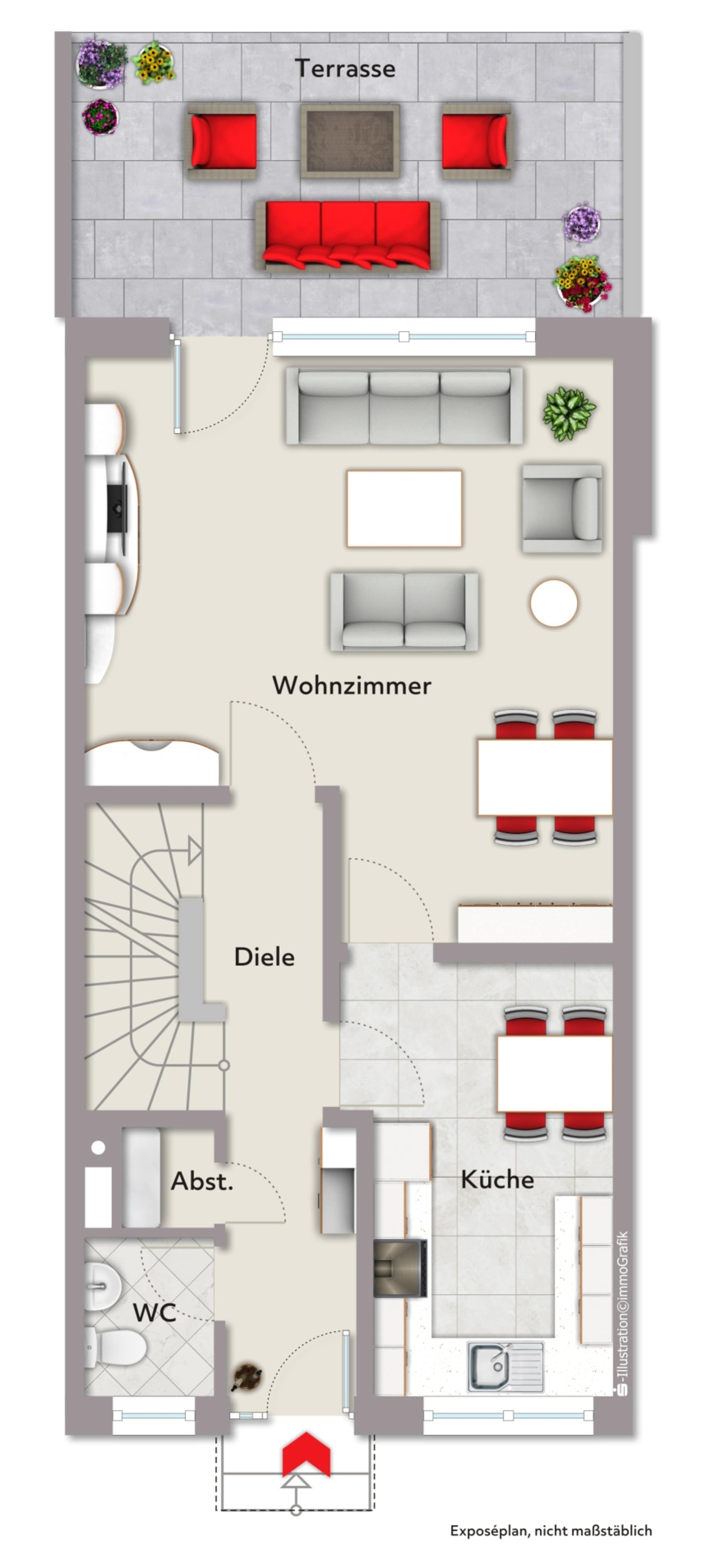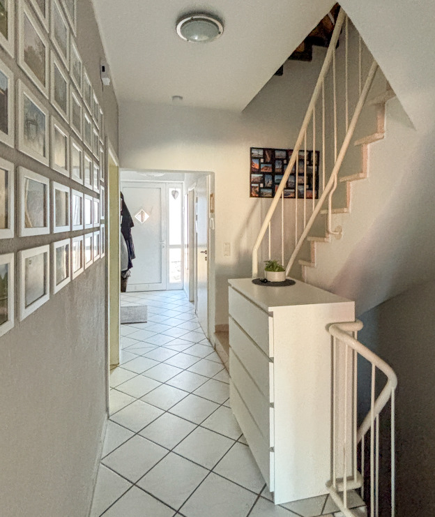 Im Erdgeschoss empfängt Sie eine freundliche Diele, von der aus sowohl das Gäste-WC als auch ein praktischer Abstellraum erreichbar sind. Die Küche ist funktional angebunden und öffnet sich zum großzügigen Wohn- und Essbereich, der das Zentrum des Hauses bildet. Vom Wohnbereich aus gelangen Sie direkt auf die überdachte Terrasse und in den kleinen, blickgeschützten Garten, der sich pflegeleicht gestaltet und zum Entspannen im Freien einlädt.