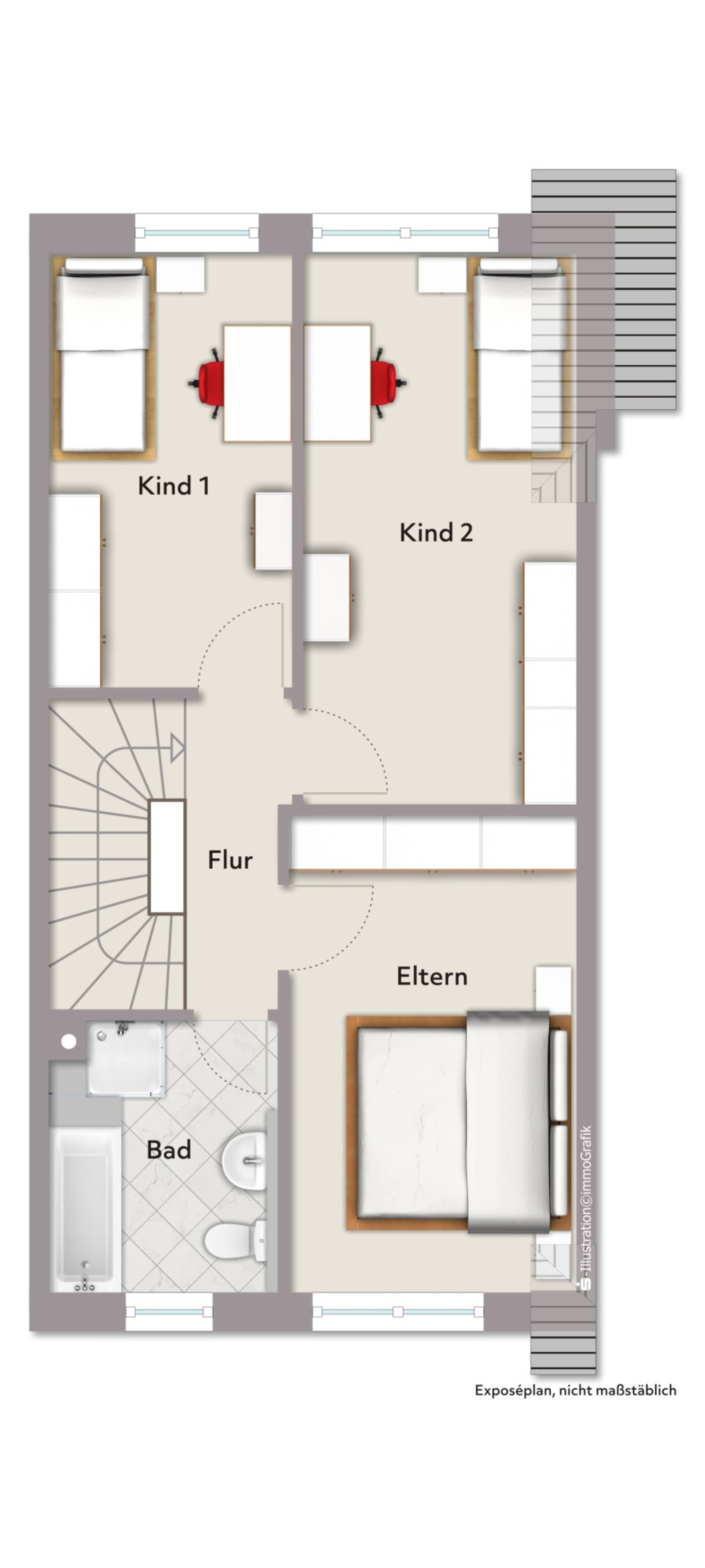 Im Dachgeschoss befinden sich die privaten Räume des Hauses. Hier stehen zwei Kinderzimmer, ein Elternschlafzimmer sowie ein Familienbad zur Verfügung. Das Badezimmer ist komfortabel ausgestattet und verfügt über Badewanne, Dusche, Waschbecken und WC.