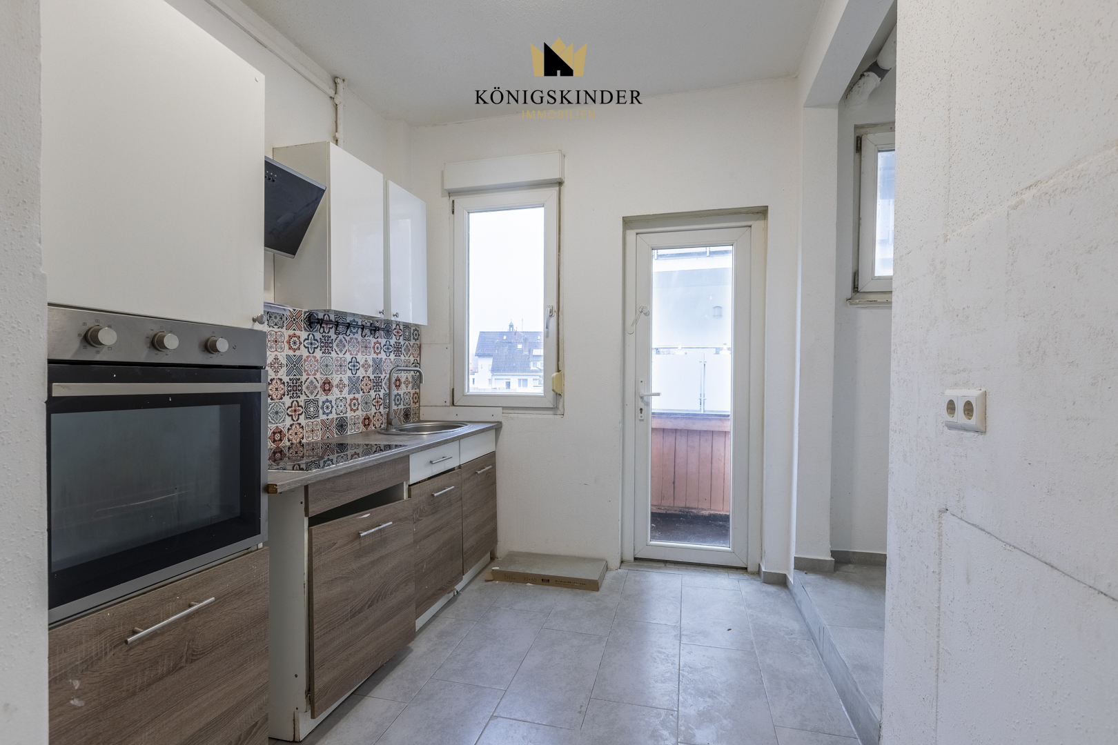 Von der Küche aus gelangen Sie auf den überdachten Balkon. Mit Blick auf den grünen Innenhof lädt dieser direkt zum Entspannen ein.