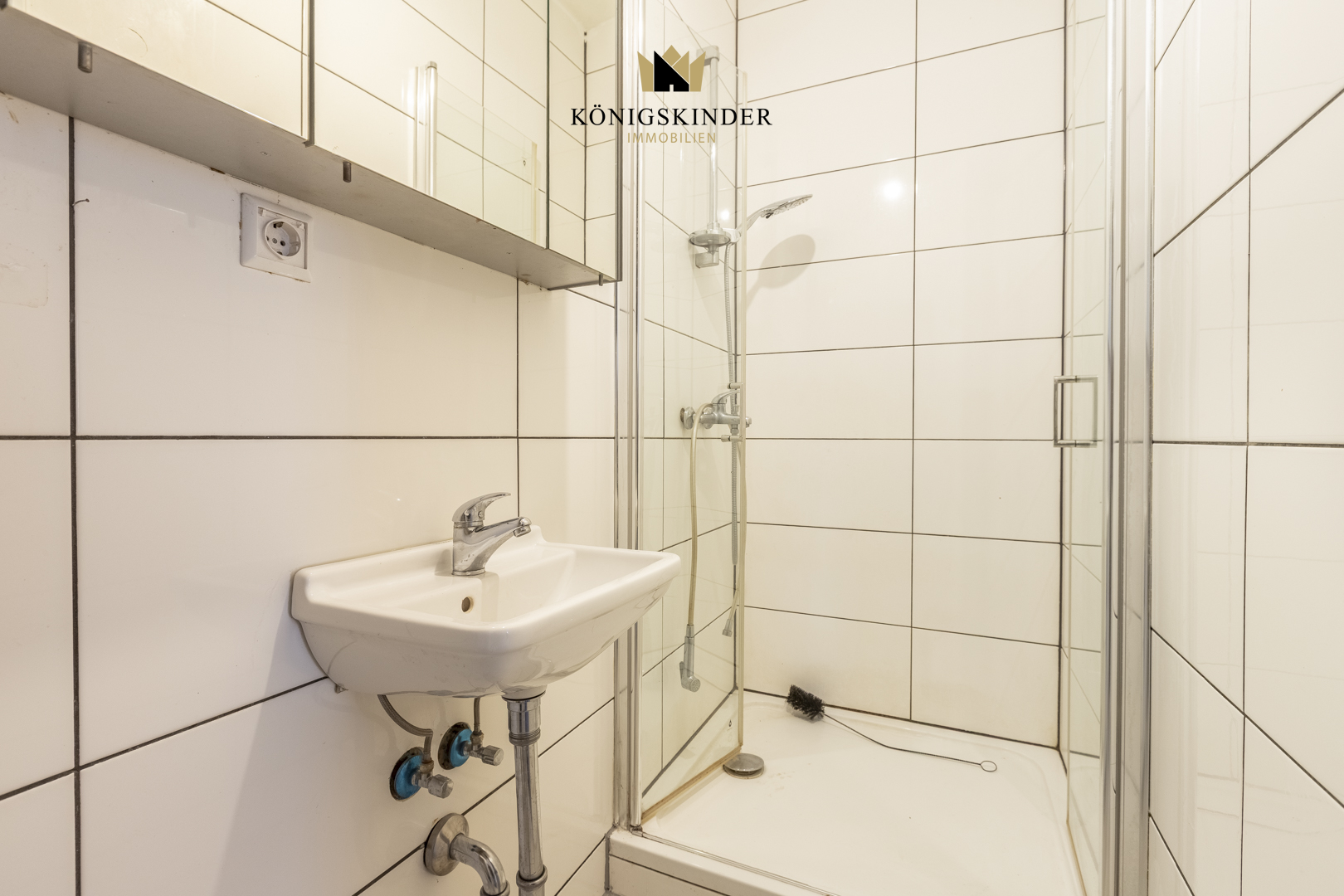 Über den Flur gelangen Sie ebenfalls direkt in das Badezimmer, ausgestattet mit Waschbecken, einer Dusche und einem WC. Die drei Individualzimmer der Wohnung verfügen über einen vorteilhaften Schnitt und Größe, wobei alle hiervon über den Flur erreichbar sind.