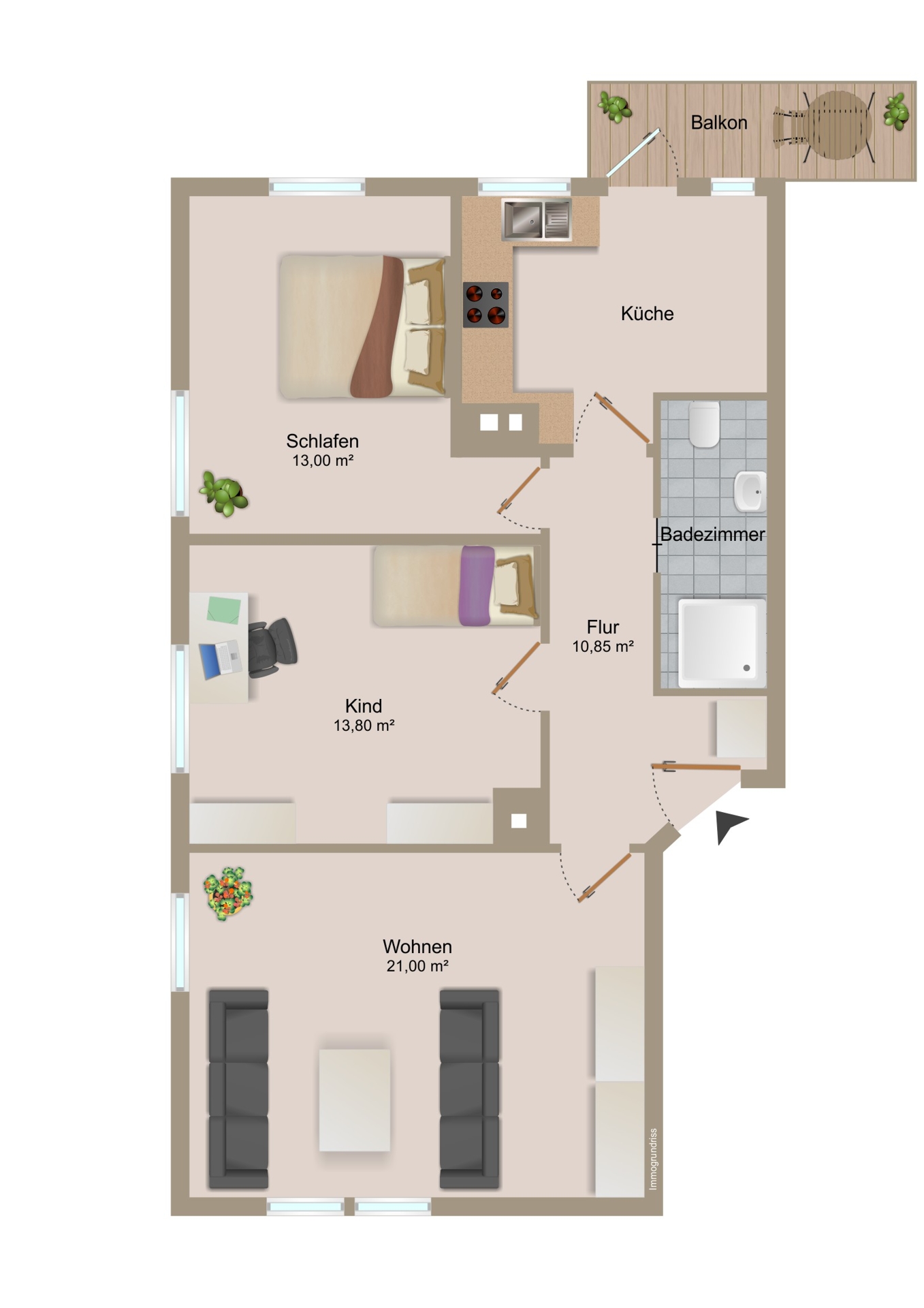 * einen Flur, welcher genügend Platz für eine Garderobe bietet