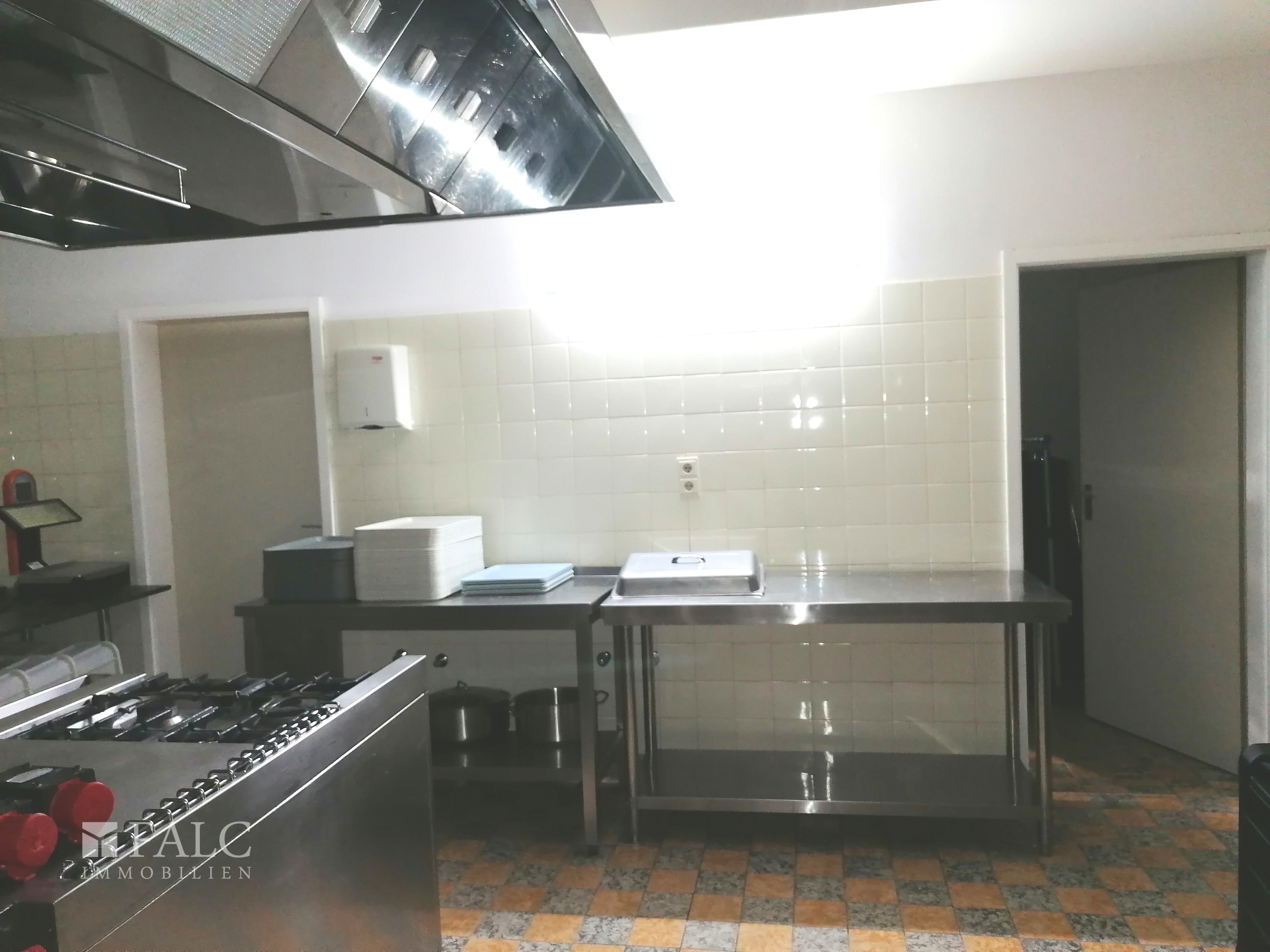 Die Küche, das Herzstück jeder Gastronomie, ist großzügig dimensioniert und bietet ausreichend Platz für die Zubereitung kulinarischer Köstlichkeiten. Sie ist funktional gestaltet und ermöglicht einen reibungslosen Arbeitsablauf.