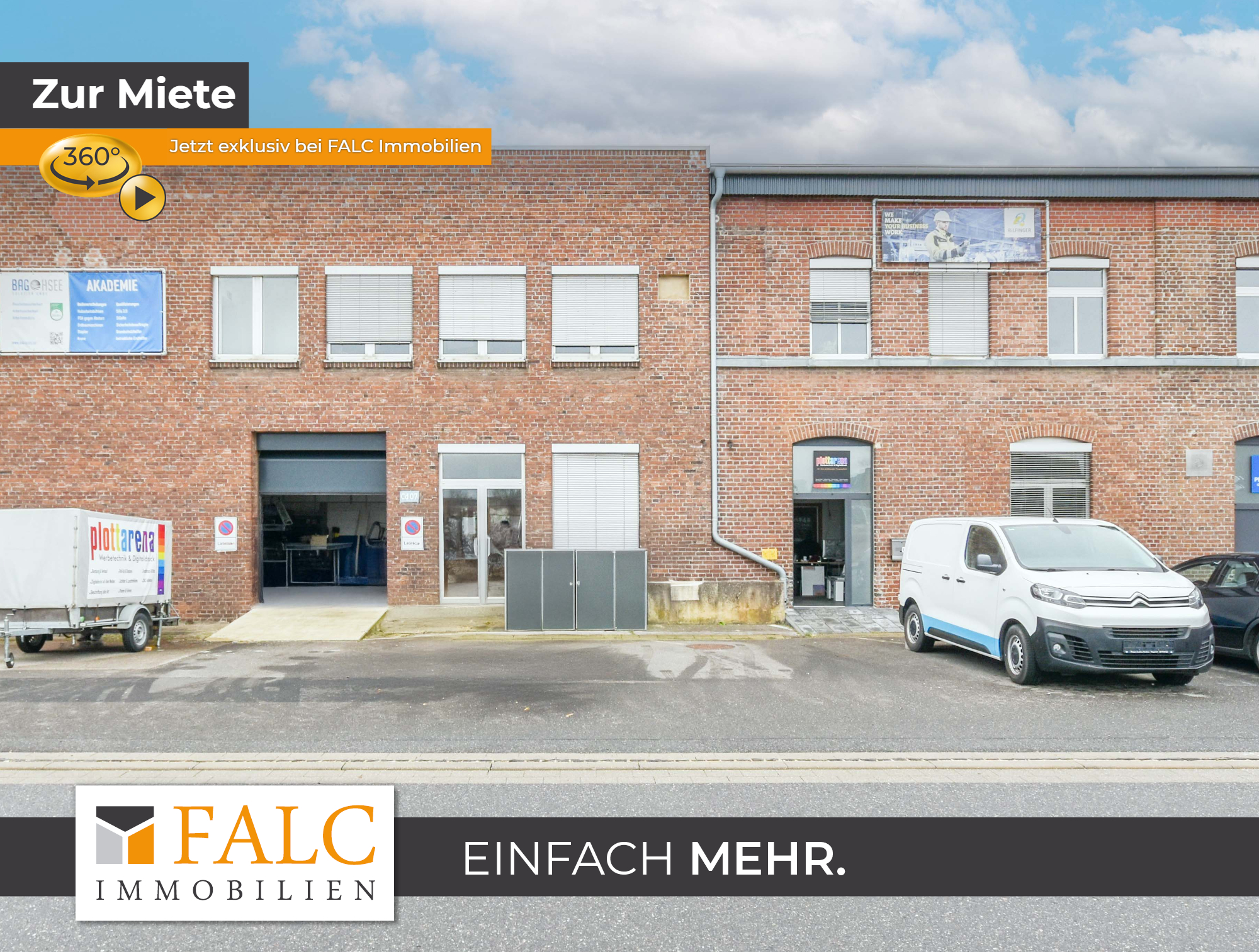 + Vielfältige gewerbliche Nutzungsmöglichkeiten (alle Gewerke zulässig) + Gewerbefläche ca. 160 m² + Deckenhöhe ca. 5,00 m (Firsthöhe) + Separate Bürofläche mit eigenständigem WC-Bereich vorhanden + Problemlos befahrbare LKW-Zufahrt + Rampe für Be- und Entladung vorhanden + LAN-Verkabelung bereits installiert + 24/7-Zugang zur Fläche möglich + Vier Außenstellplätze vorhanden + Pförtnerdienst inklusive Wachschutz vorhanden + Vier großzügige Lagerräume / Lagerhallen verfügbar + Übernahme des bestehenden Mietvertrages möglich