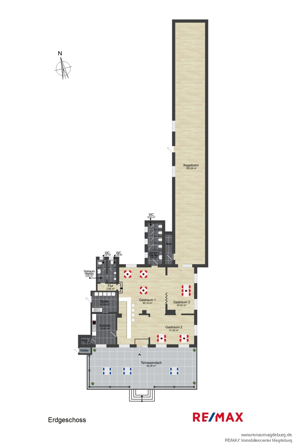 Die Gasträume 1 bis 3 sind funktional miteinander verbunden und bilden eine zusammenhängende Bewirtungsfläche, die sich flexibel für verschiedene Gastronomiekonzepte nutzen lässt. Direkt angeschlossen befindet sich eine rund 135 m² große Kegelbahn – ein Alleinstellungsmerkmal, das den Betrieb sowohl für Stammkundschaft als auch für Veranstaltungen besonders attraktiv macht.