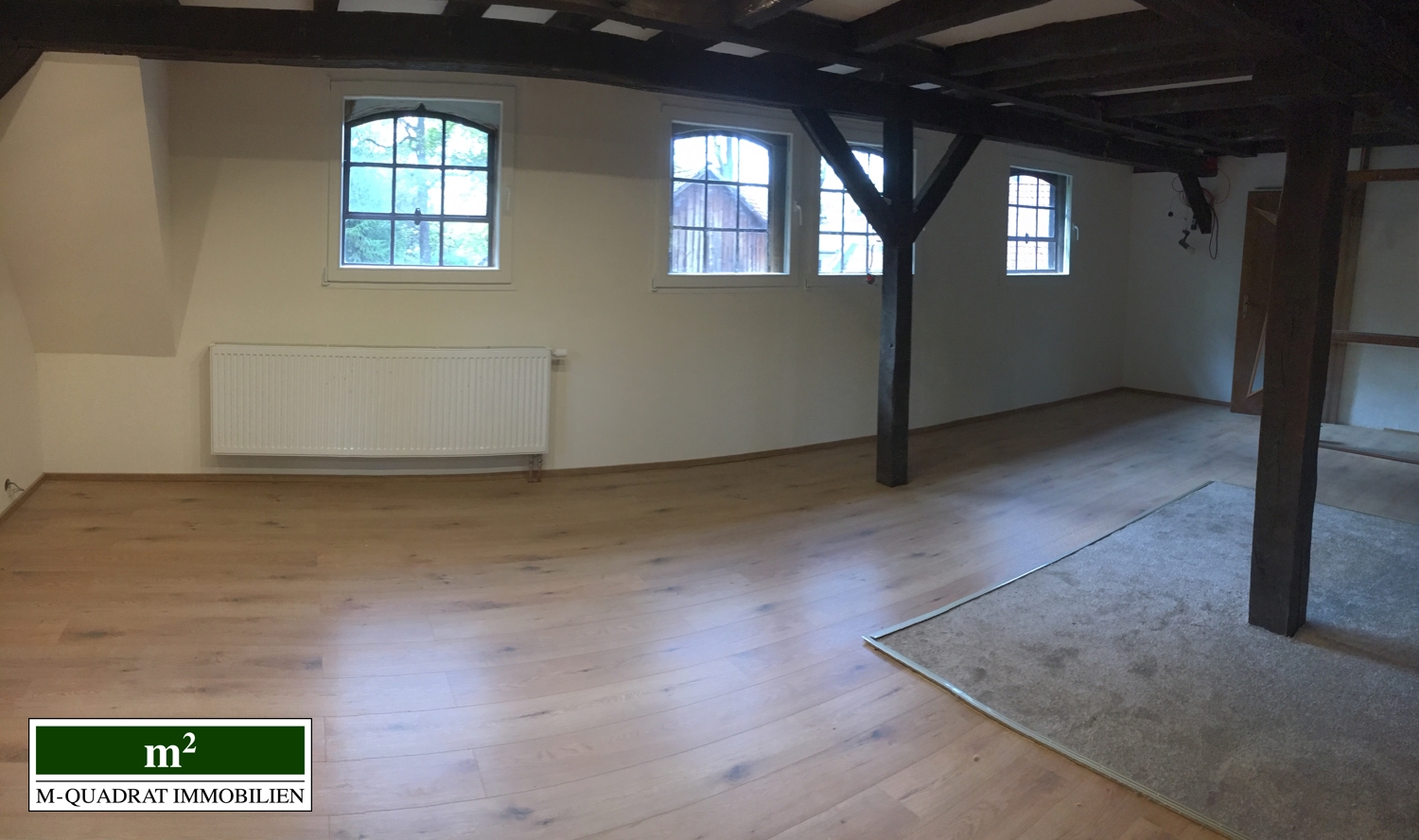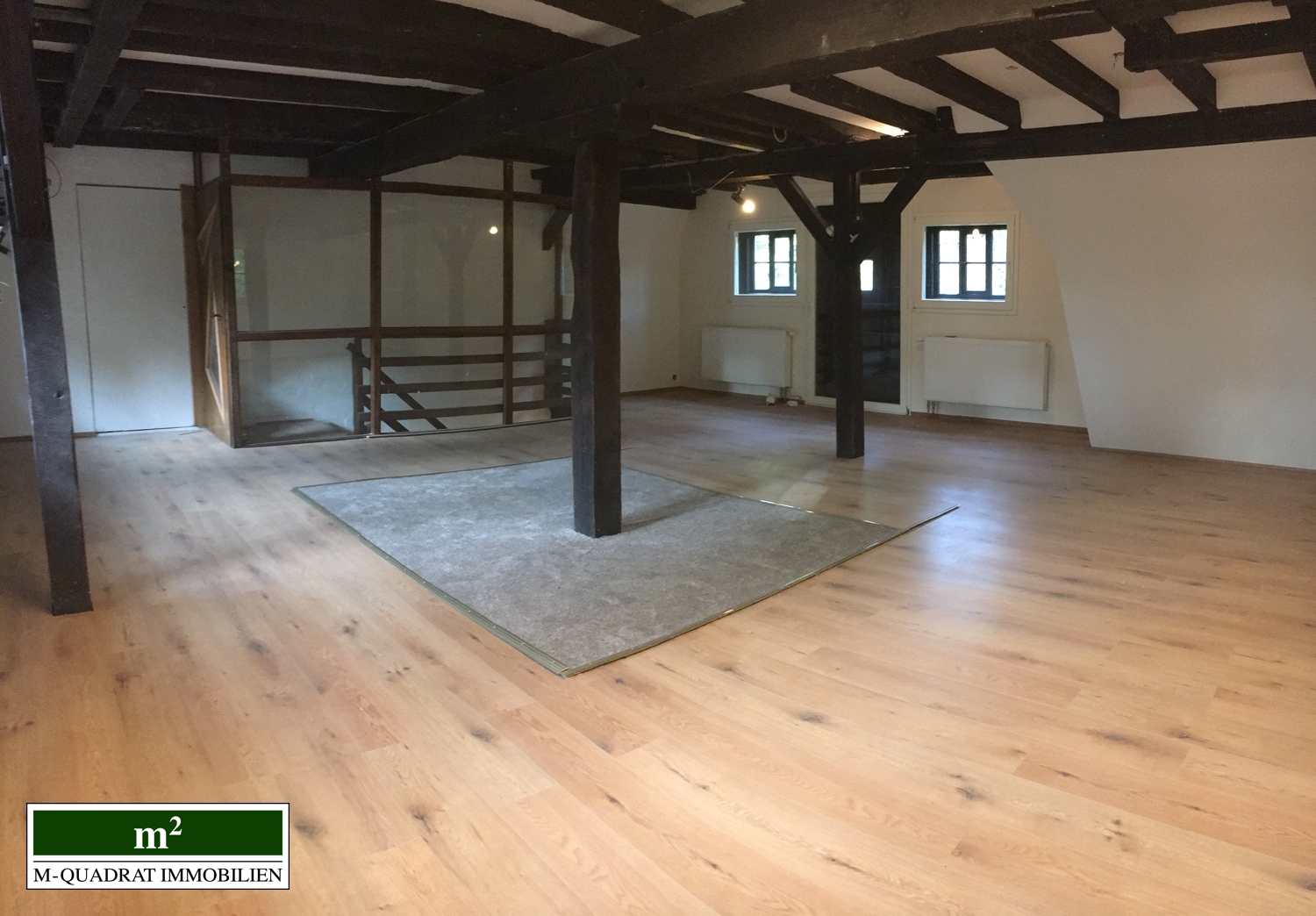 Die links im Gebäude vorhandenen Räumlichkeiten, in denen historisch der Mühlenbetrieb stattfand, versprühen Fachwerkcharme und bieten zugleich Platz für individuelle, moderne Arbeitsplätze, Ladenflächen und eigener Ideen bei flexibler Raumaufteilung.