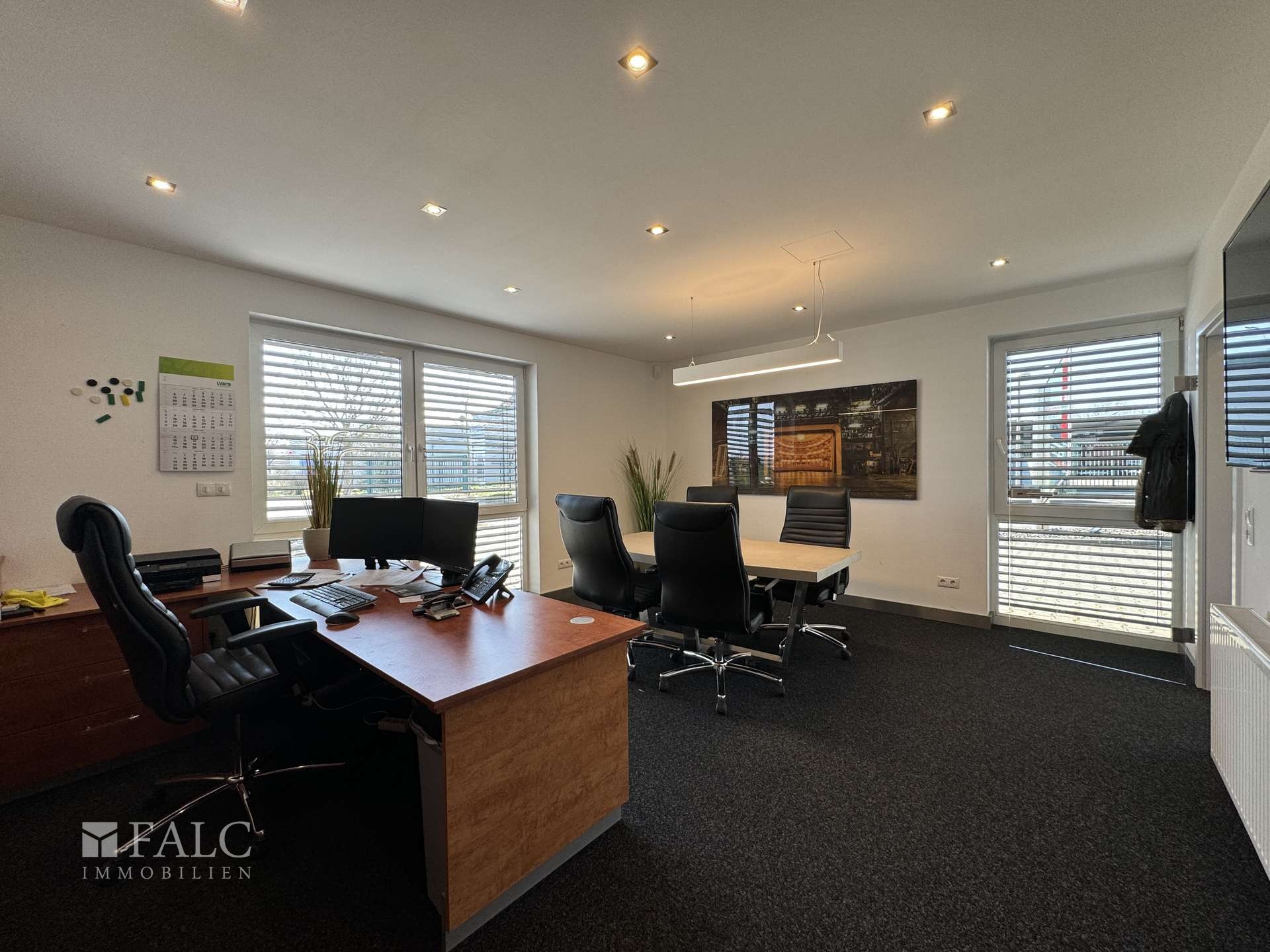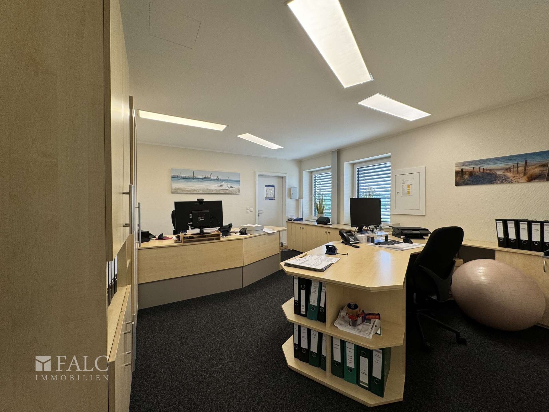 Beim Betreten des Gebäudes fällt sofort die großzügige und helle Gestaltung der Räume auf. Die Büros mit zur Zeit 4 Arbeitsplätzen sind mit großen Fenstern ausgestattet, die viel Tageslicht hereinlassen und eine angenehme Arbeitsatmosphäre schaffen. Die Beleuchtung wird durch moderne Einbauleuchten ergänzt, die eine gleichmäßige Ausleuchtung gewährleisten.